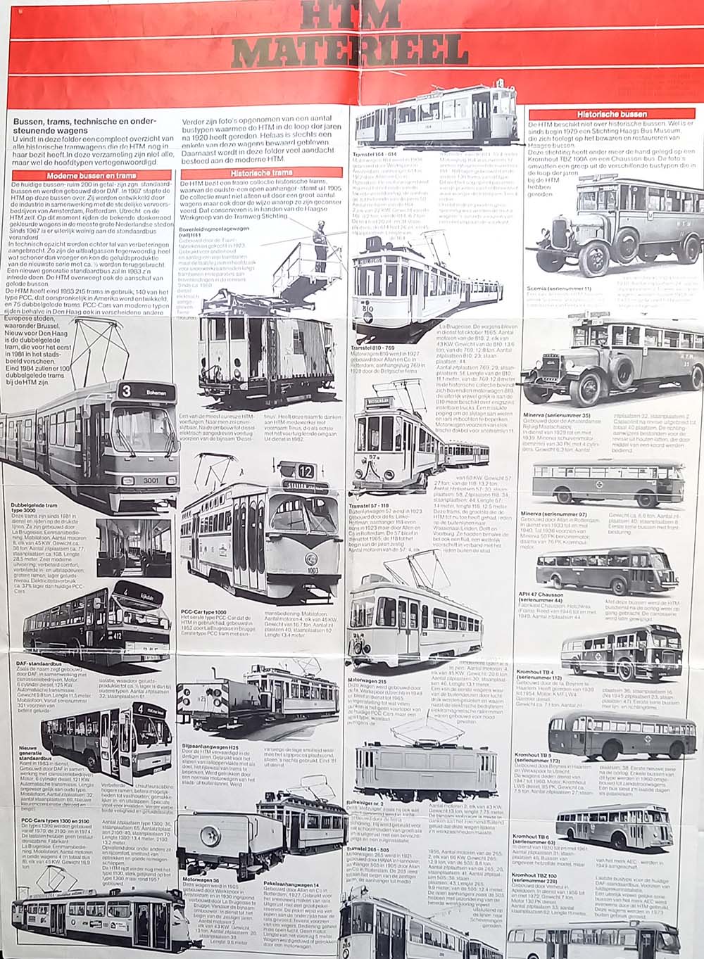 Deze folder op posterfor-maat toont een compleet overzicht van alle historische tramwagens die de HTM nog in haar bezit heeft. Verder zijn foto's opgenomen van een aantal bustypen waarmee de HTM in de loop der jaren na 1920 heeft gereden. Daarnaast wordt in deze folder veel aandacht besteed aan de moderne HTM.