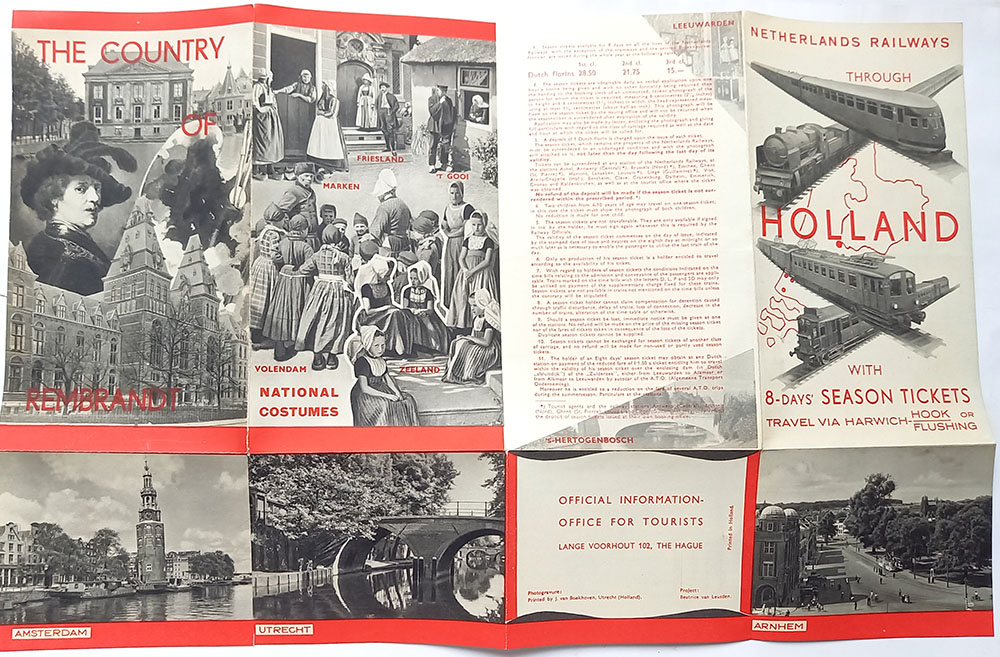 Een unieke folder uitgegeven door de Amerikaanse Ambassade in Den Haag, toen nog gezeteld op het Lange Voorhout 102. De folder bevat "officiele" toeristeninformatie. "The Country of Rembrandt". Engelstalig.