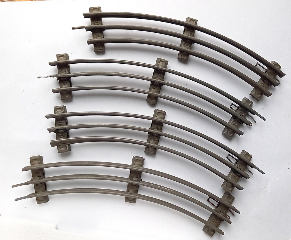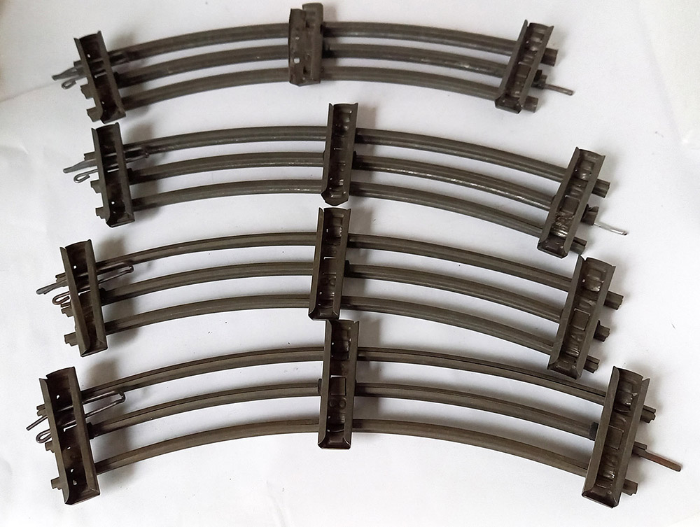 samen een halve cirkel vormend. Met geïsoleerde middenrail, geschikt voor electrisch rijden. Spoor-0. Goede staat.