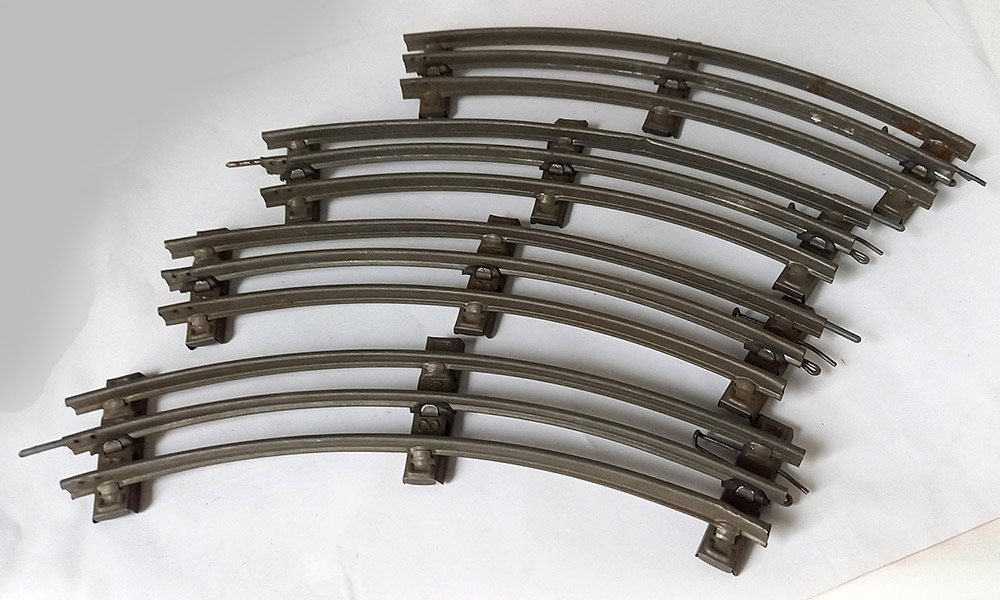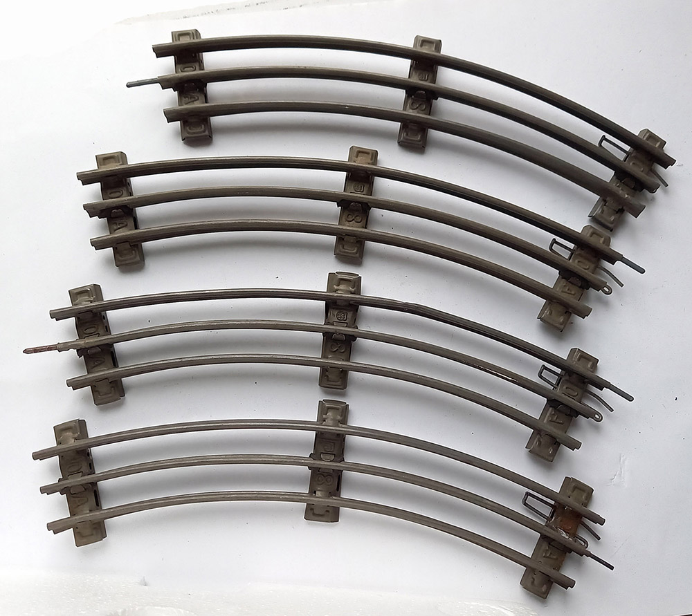 samen een halve cirkel vormend. Met geïsoleerde middenrail, geschikt voor electrisch rijden. Spoor-0. Redelijke staat.