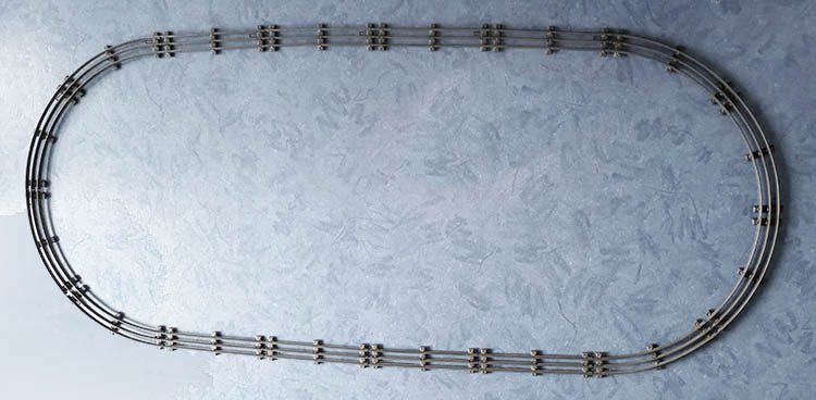Spoor-0. Rails voor het maken van een ovaal, bestaande uit 8 standaardbochten en 8 rechte rails (standaard). Met geïsoleerde middenrail, geschikt voor electrisch rijden. Goede staat.