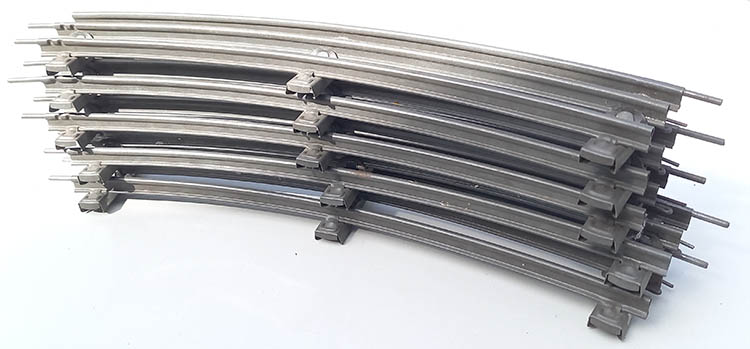 5 stuks. ca. 32 cm. Buitenbocht met geïsoleerde middenrail, geschikt voor electrisch rijden. Spoor-0. Goede staat.