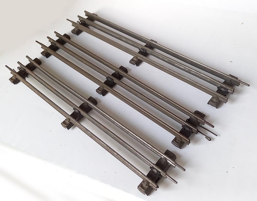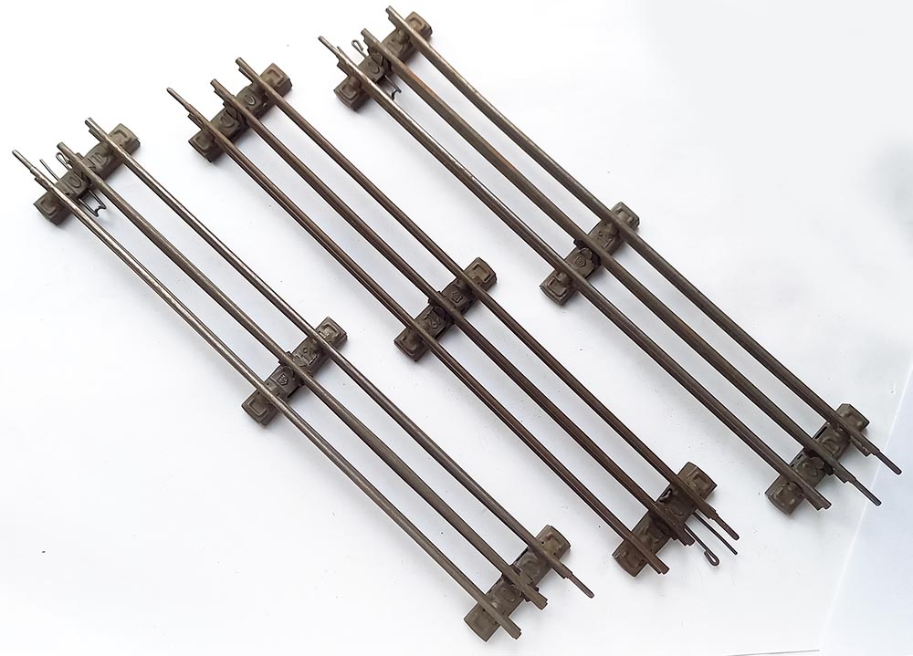 3 stuks. Lengte: 32 cm. Met geïsoleerde middenrail, geschikt voor electrisch rijden. Spoor-0.