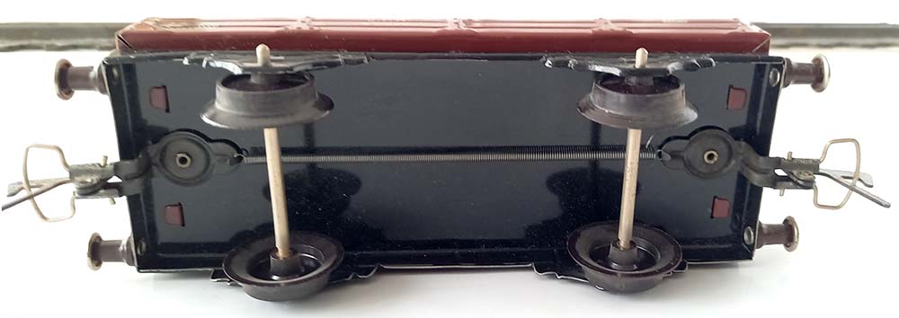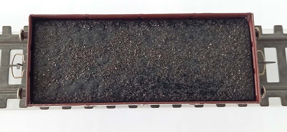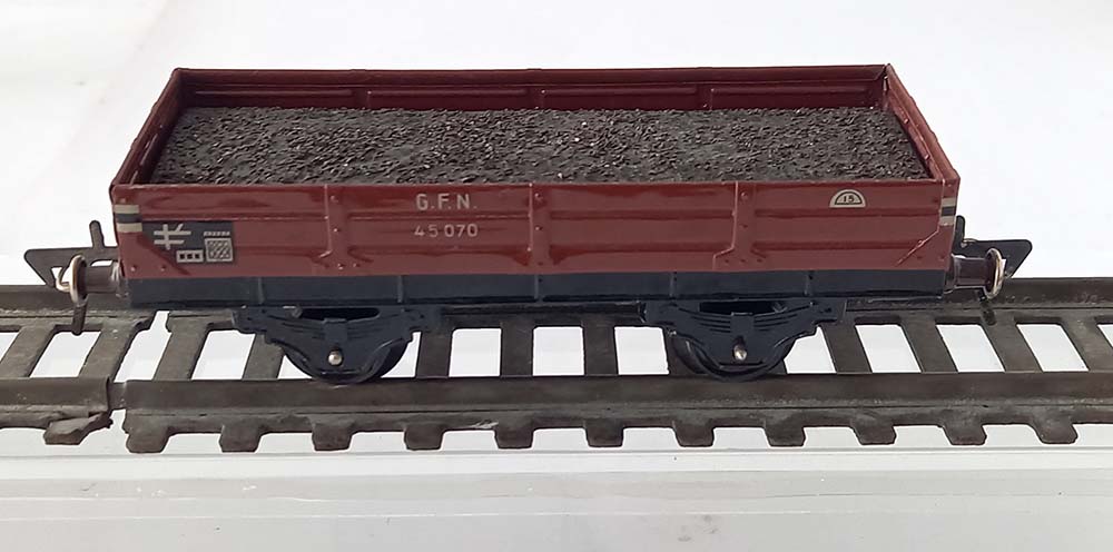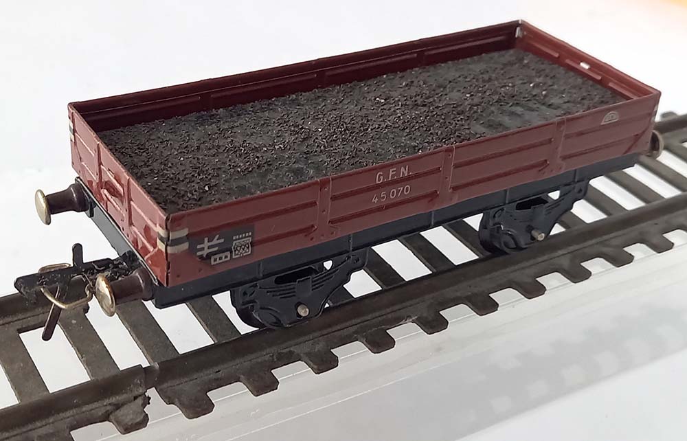 Spoor-0, 50-er jaren, 2-assig, bruin, plaatstaal, lengte 15 cm, beladen met kolen. Uitstekende staat.
