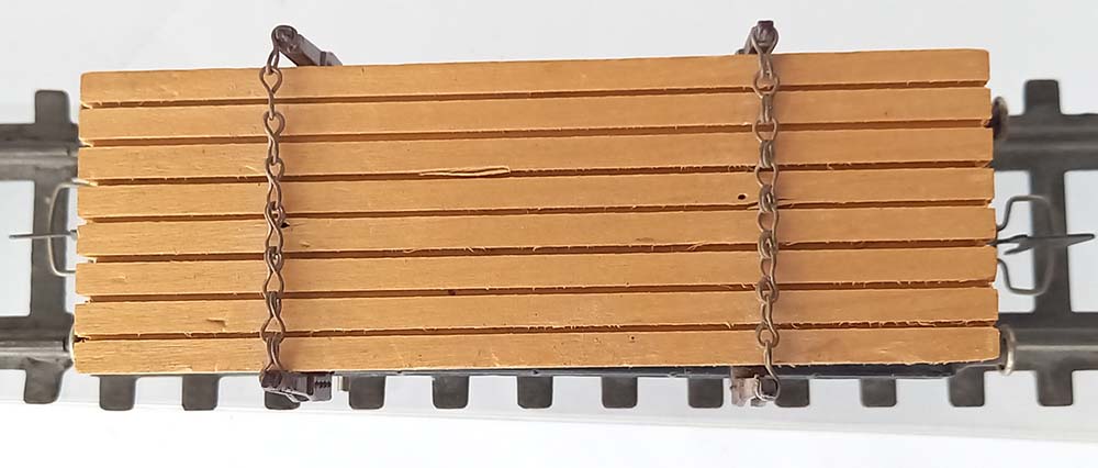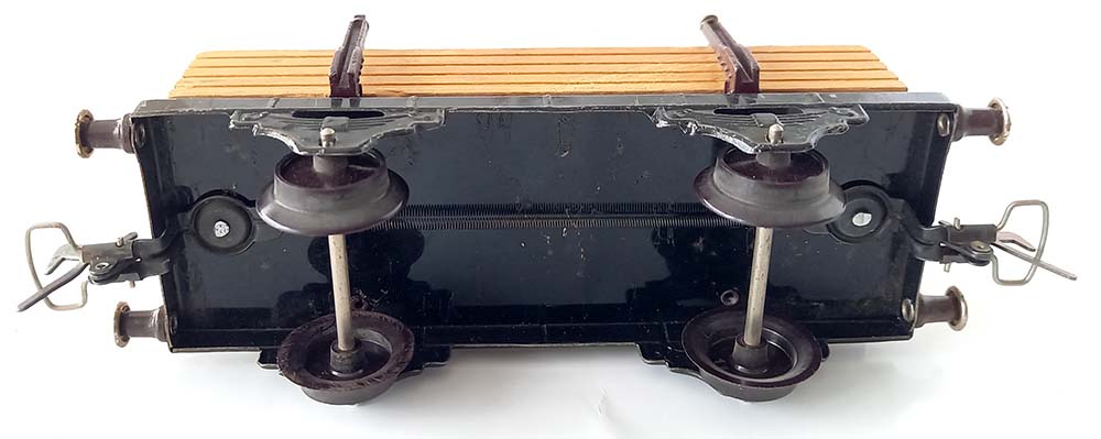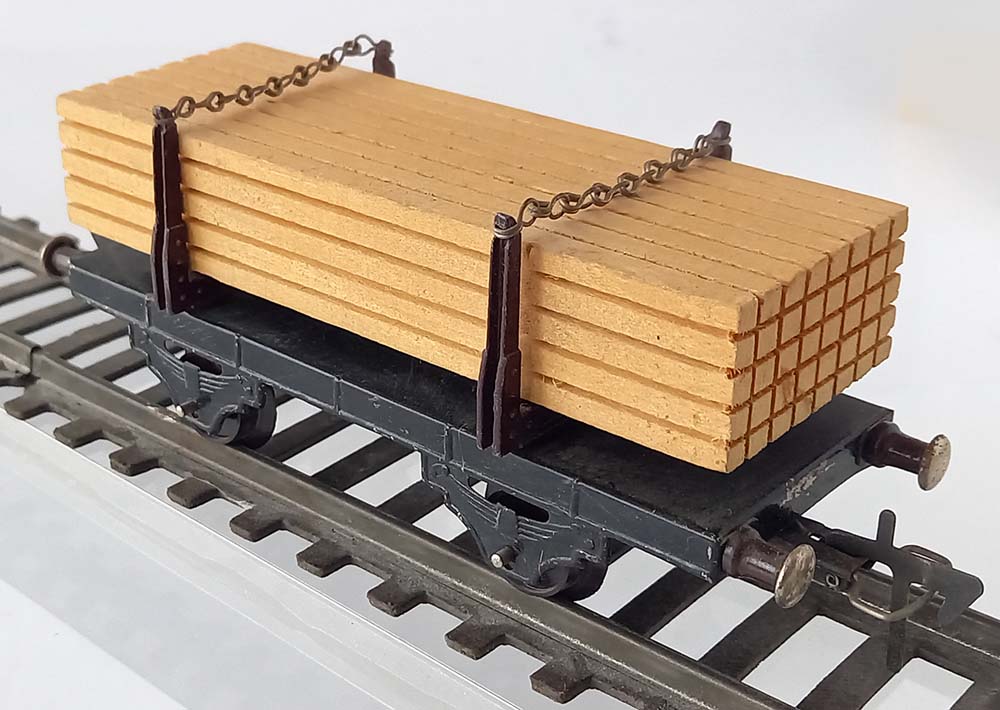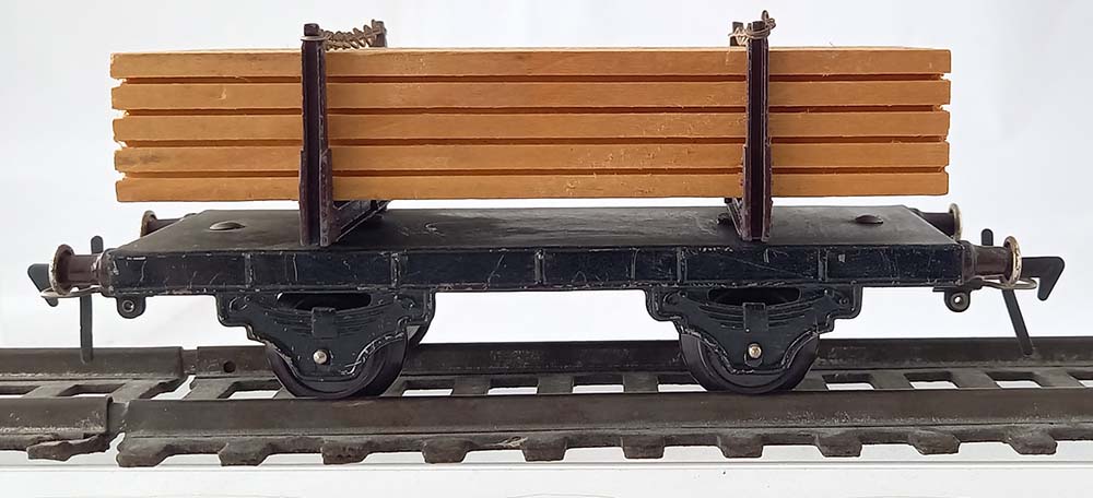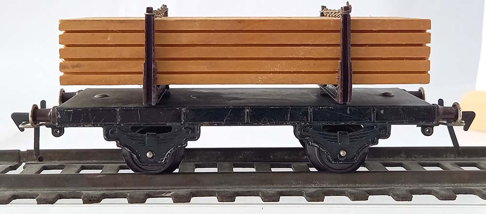 Spoor-0, 50-er jaren, 2-assig, plaatstaal, beladen met langhout, lengte 15 cm. Uitstekende staat.