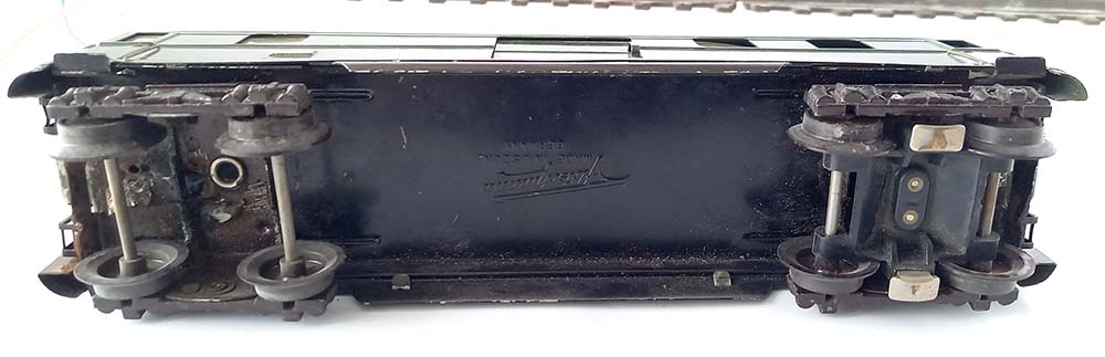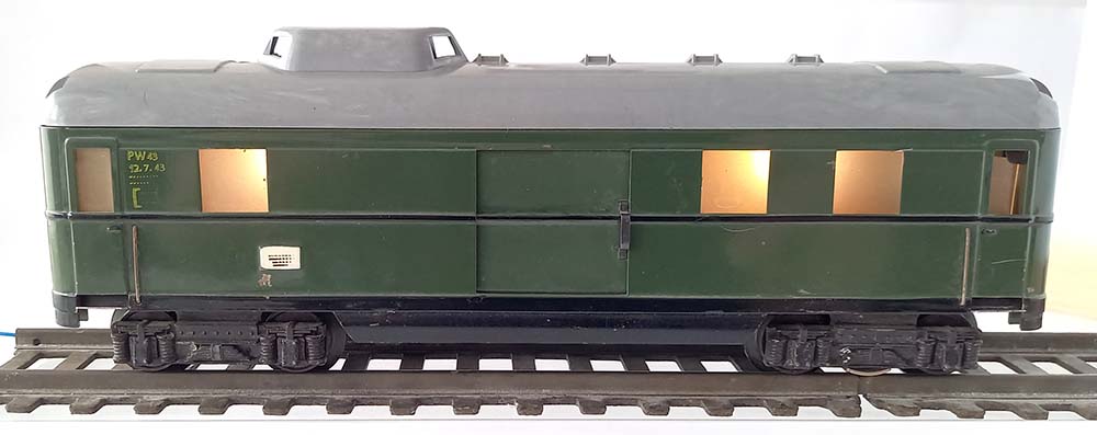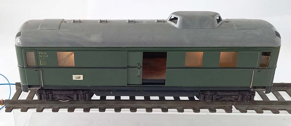 Spoor-0, van de Duitse Spoorwegen, 2 beweegbare schuifdeuren, binnenverlichting, opbouw van plaatstaal, gevlamd dak van kunststof met imitatie luchters, draaistellen van gietijzer, metalen assen en kunststof wielen. Lengte 24 cm. Helaas ontbreken de koppelingen.