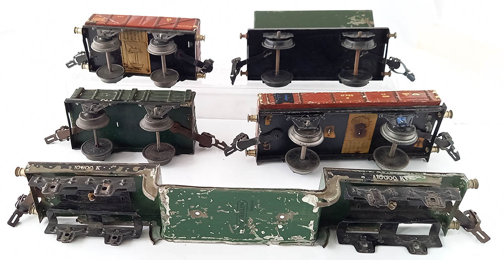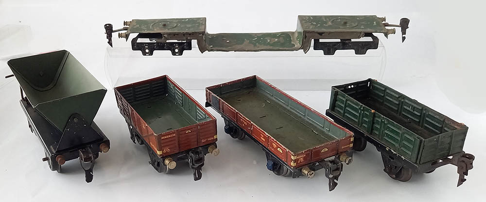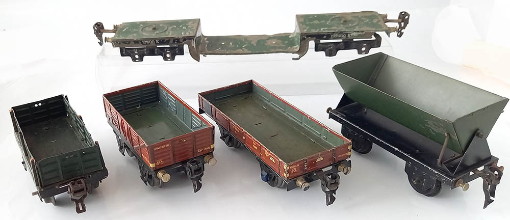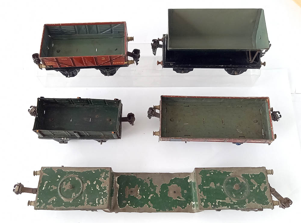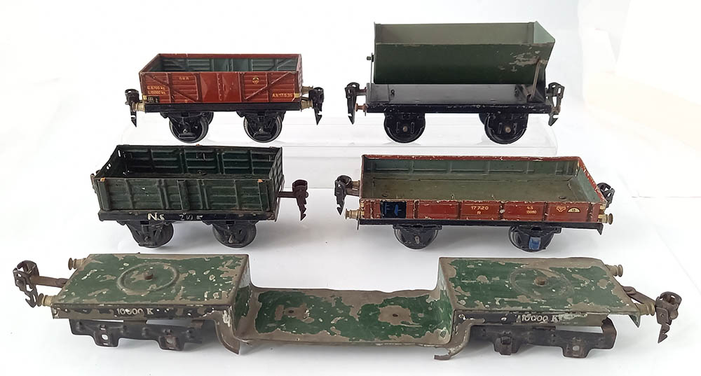 3 Märklin Lage bakwagens, een gesloopte dieplader en 1 kipwagen (merk onbekend) in bespeelde staat.