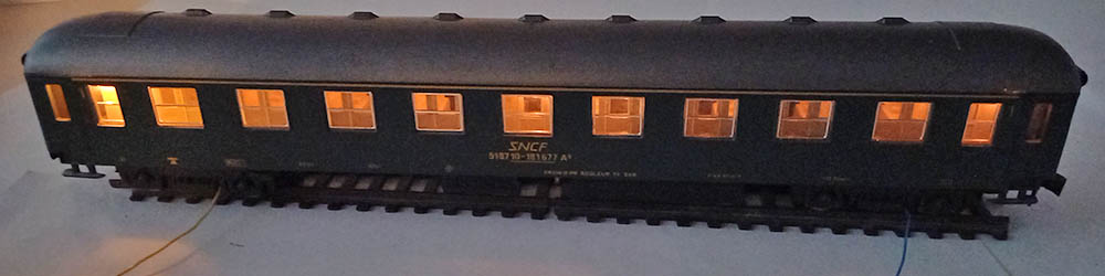 De vorige eigenaar heeft een begin gemaakt met de inbouw van verlichting en hiervoor een eigen constructie bedacht. Het rijtuig is voorzien van 10 afzonderlijke lampjes die van stroom worden voorzien door zelfgebouwde slepers op de metalen wielen van de beide draaistellen. De doorvoer vanaf de wielen op de slepers is niet in orde dat zult u zelf goed moeten maken.