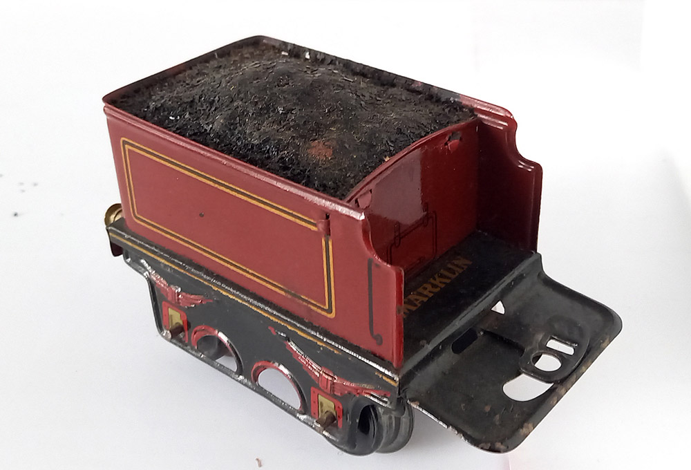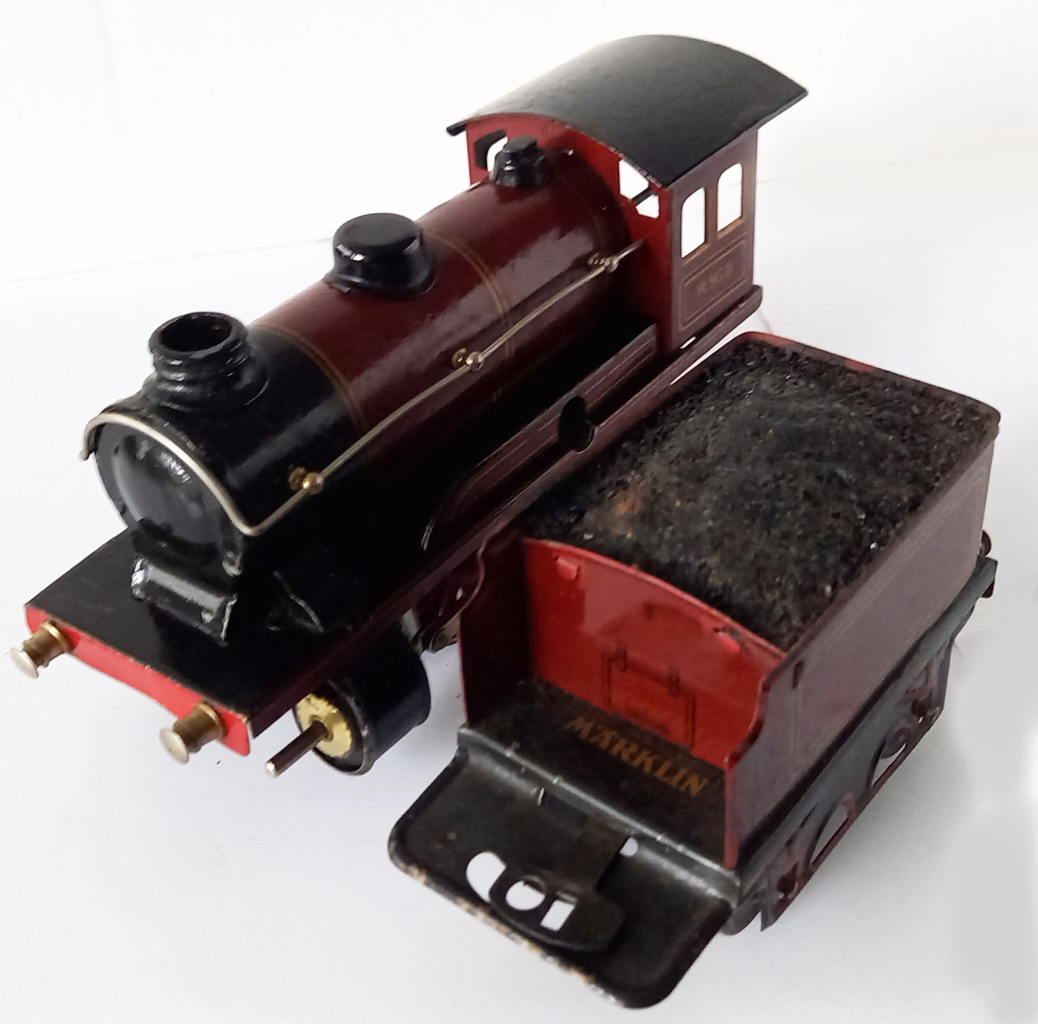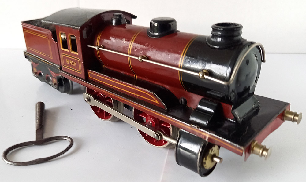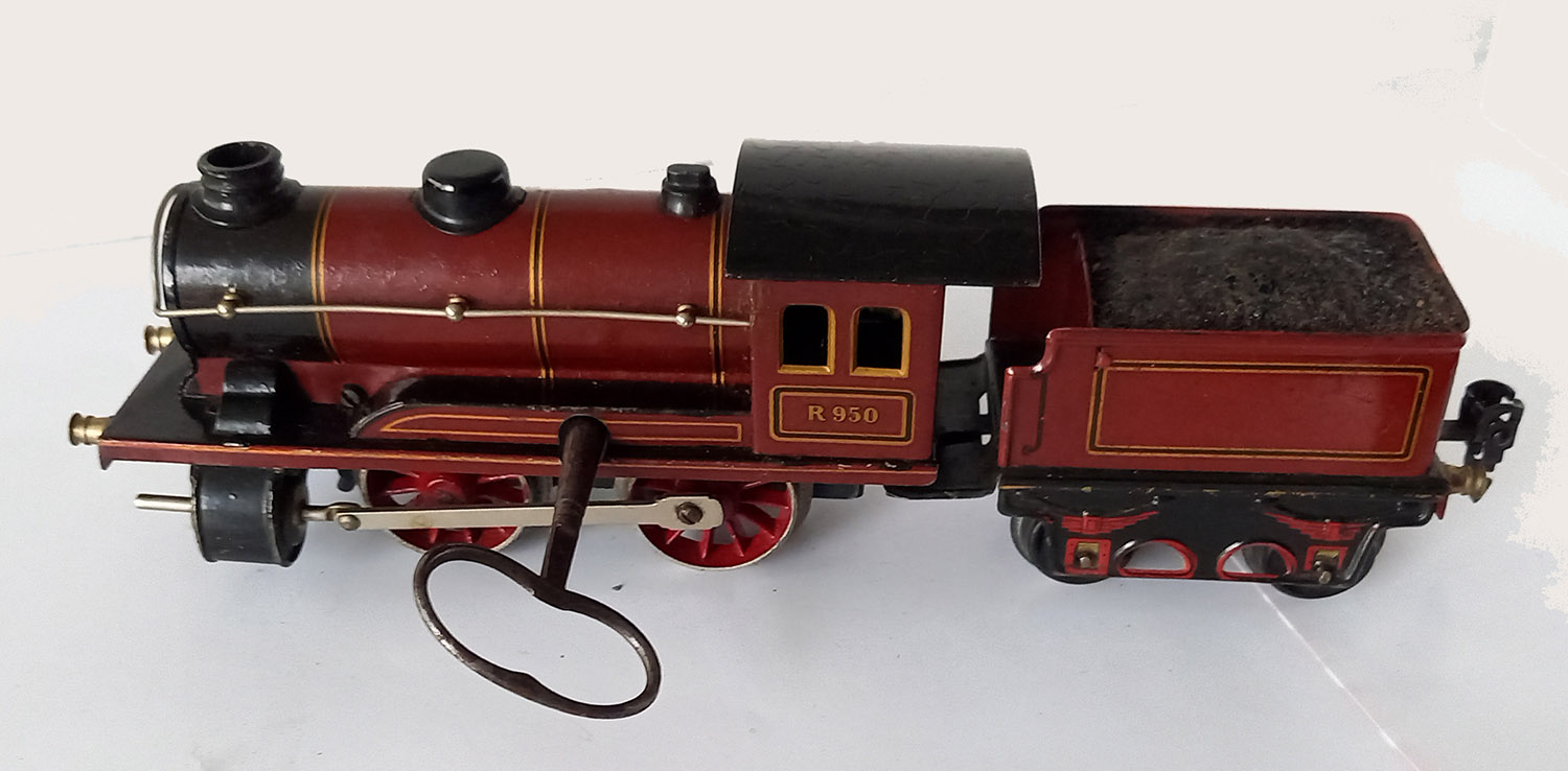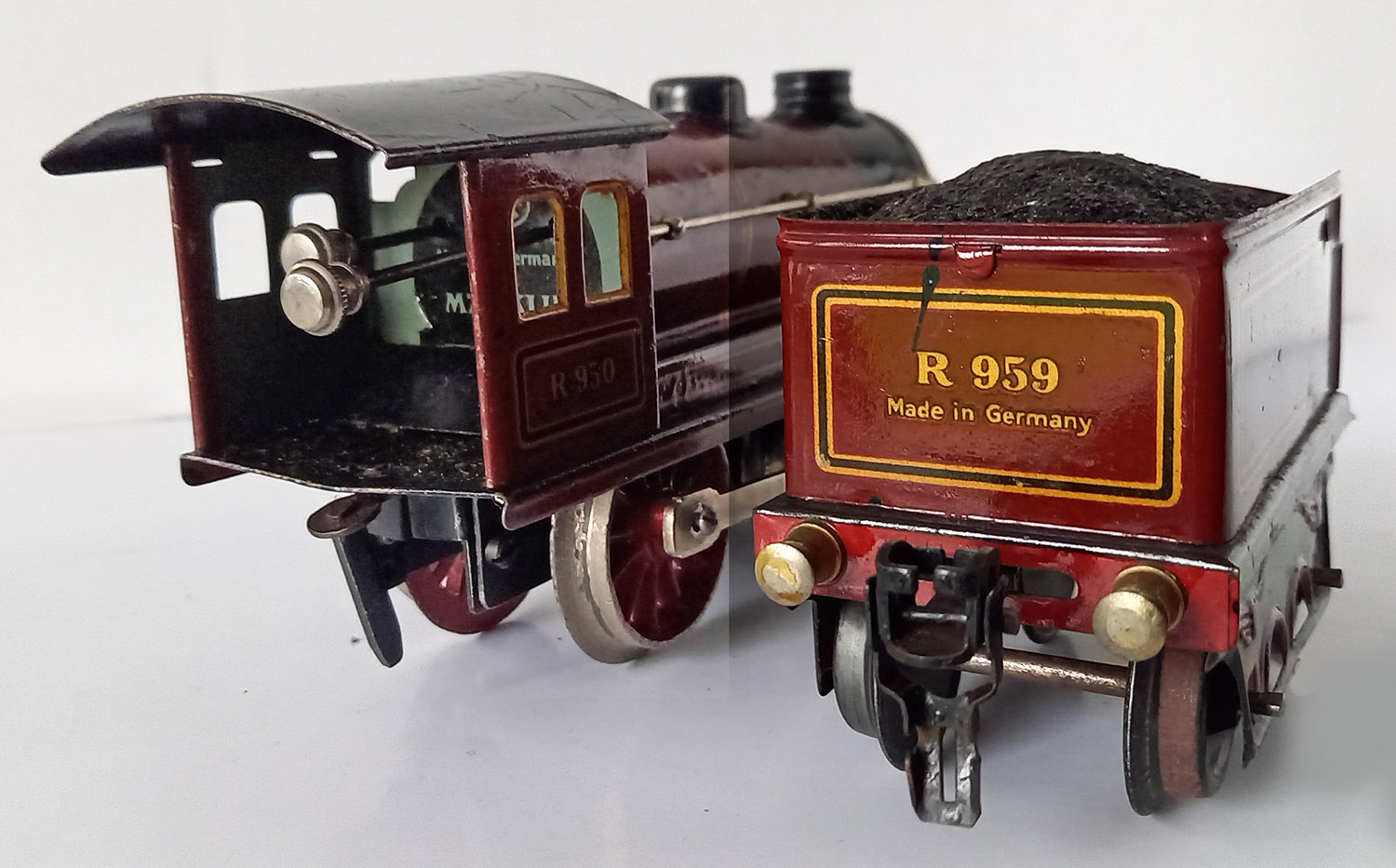 met twee assige tender nr 959, opwindbaar, roodbruin/zwart gelitographeerd metaal, lengte 29 cm, getest en werkend, rijdt voor- en achteruit, rem, drijfstangen, galeriestangen, met sleutel (maar dat is waarschijnlijk geen Märklin) Spoor-0, produktieperiode 1927-1933. Goede staat.