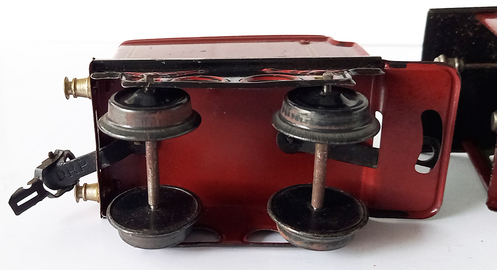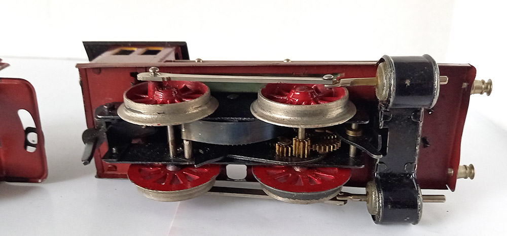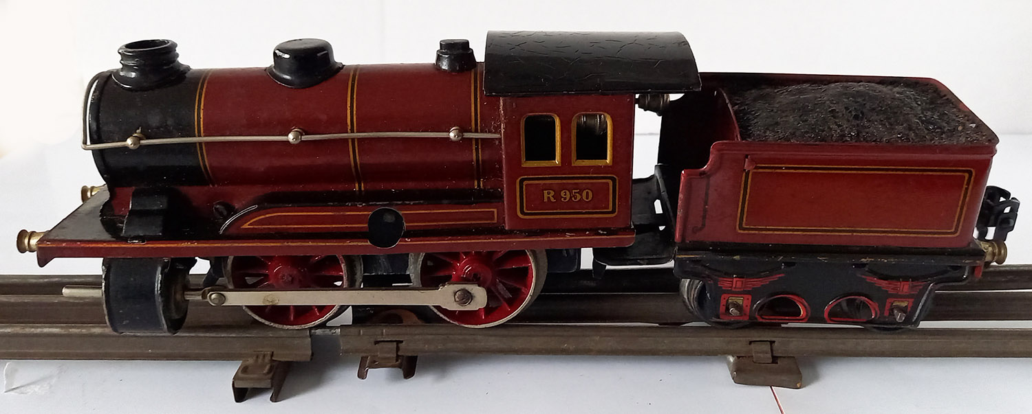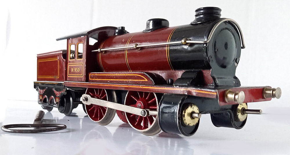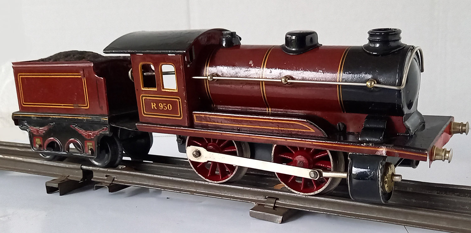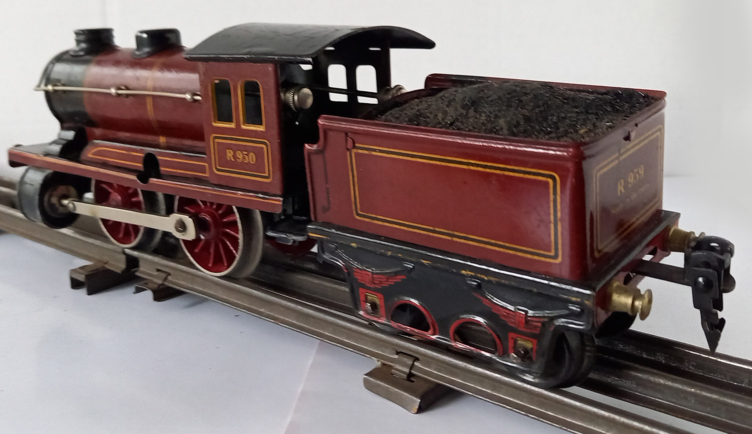 met twee assige tender nr 959, opwindbaar, roodbruin/zwart gelitographeerd metaal, lengte 29 cm, getest en werkend, rijdt voor- en achteruit, rem, drijfstangen, galeriestangen, met sleutel (maar dat is waarschijnlijk geen Märklin) Spoor-0, produktieperiode 1927-1933. Goede staat.