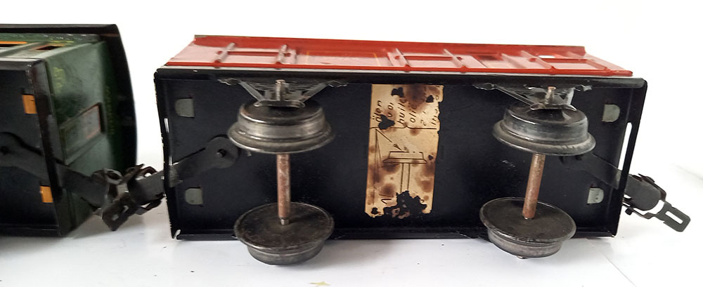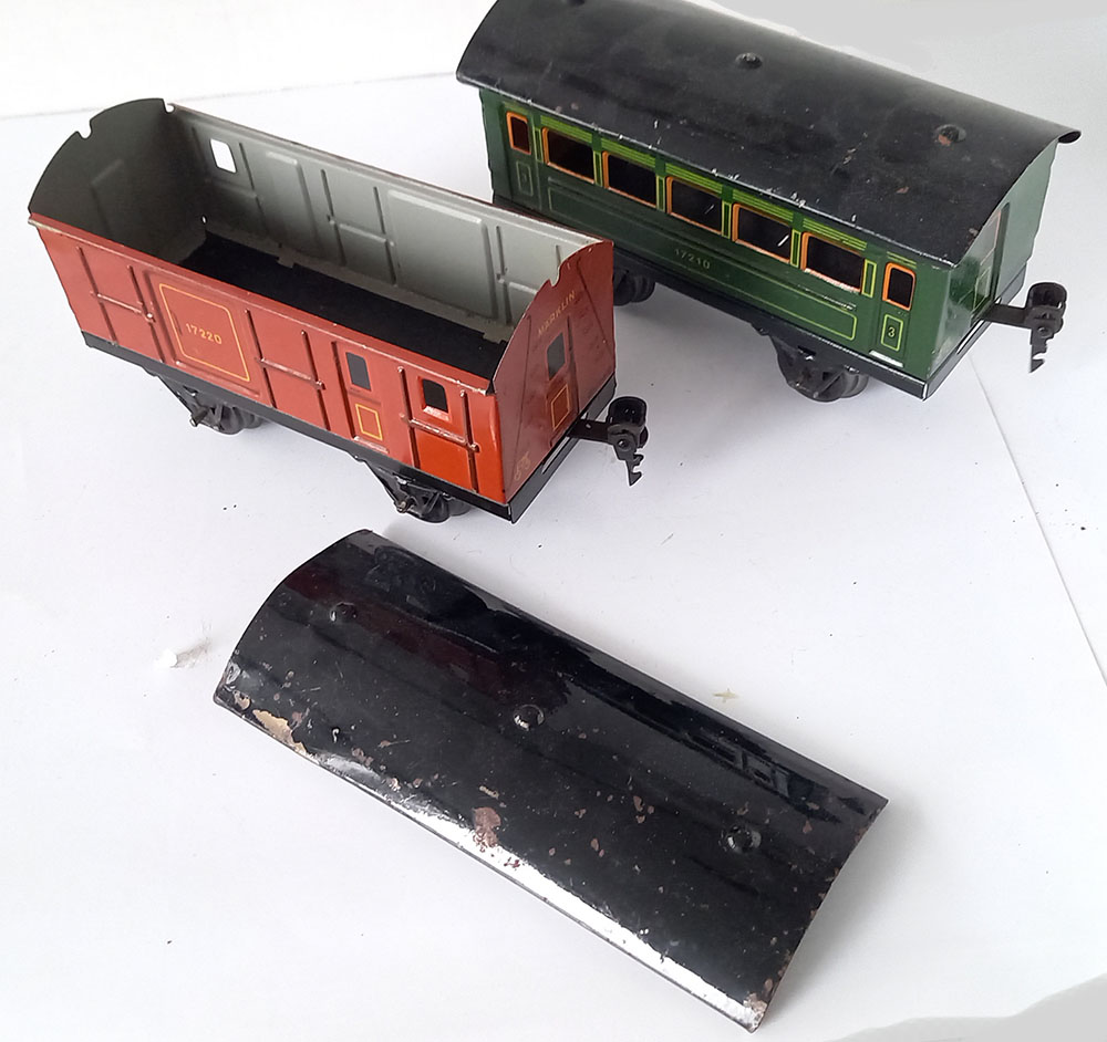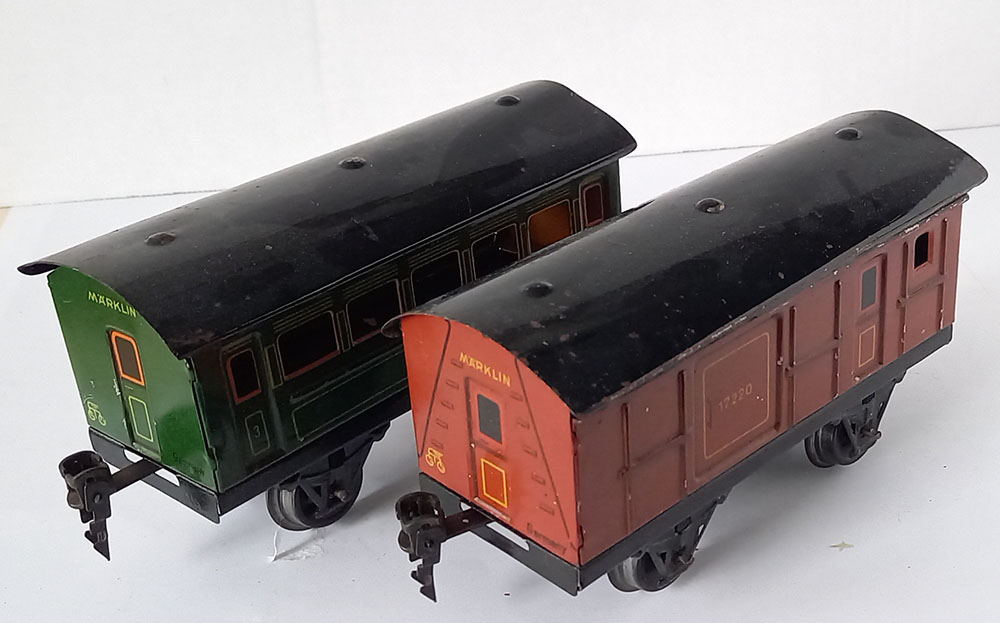 Personenwagen 1721 (1932-1937), 2-assig, lengte 14,5 cm, groen gelitographeerd metaal en daarbij bijpassende baggagewagen 1722 (1932-1937) roodbruin, gelitographeerd blik, 14,5 cm. Beide wagons zien er redelijk uit behalve de daken. Spoor-0.