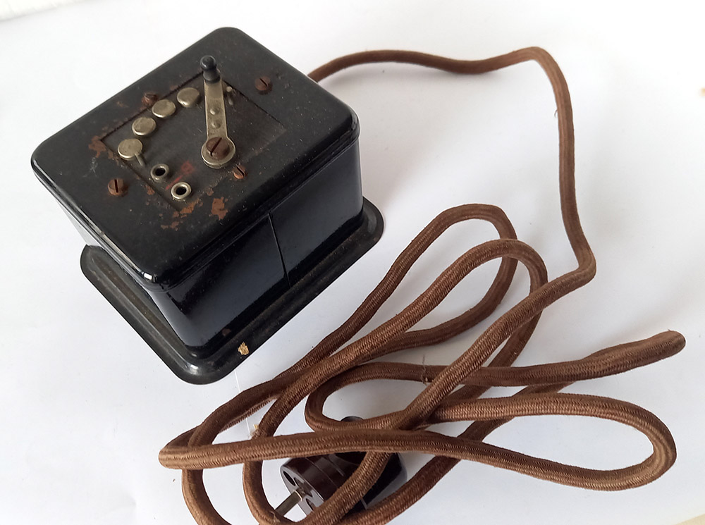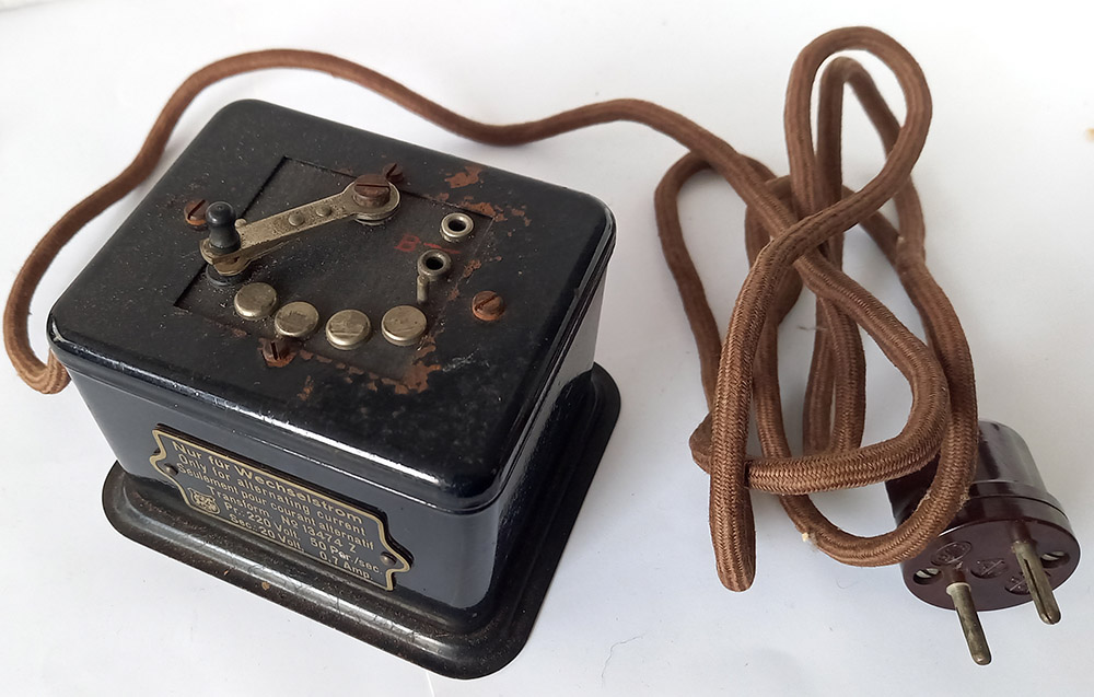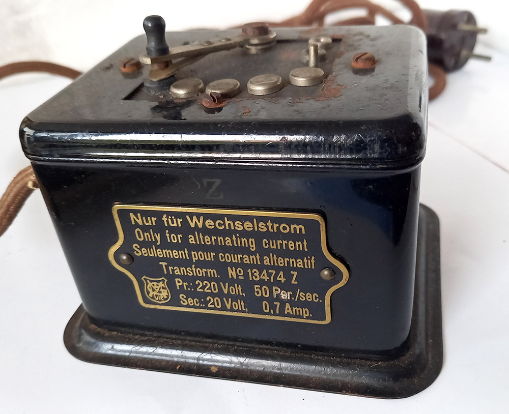 Spoor-0 transformator 50-er jaren. 20 Volt. Niet getest, stoffen kabel. Eigen risico.