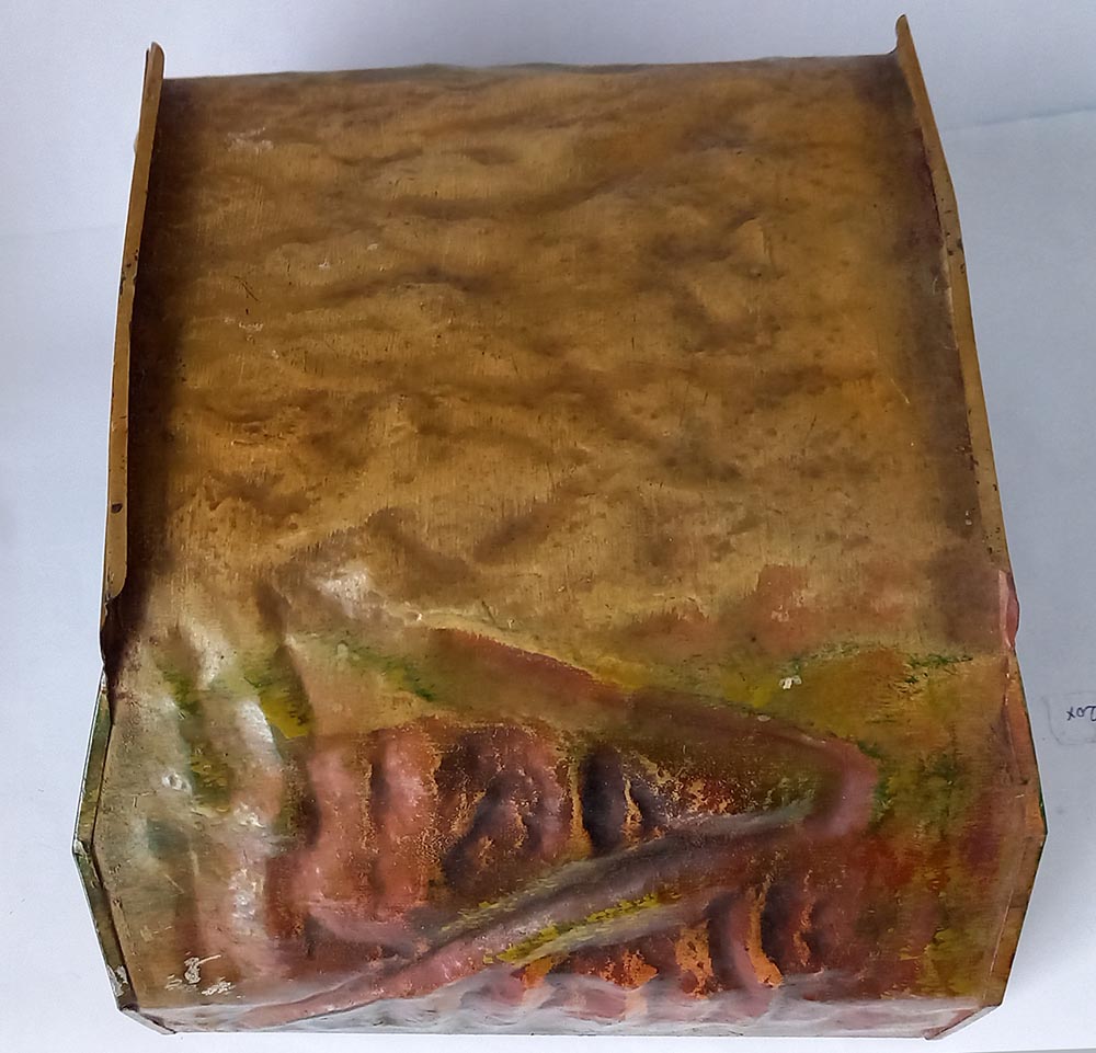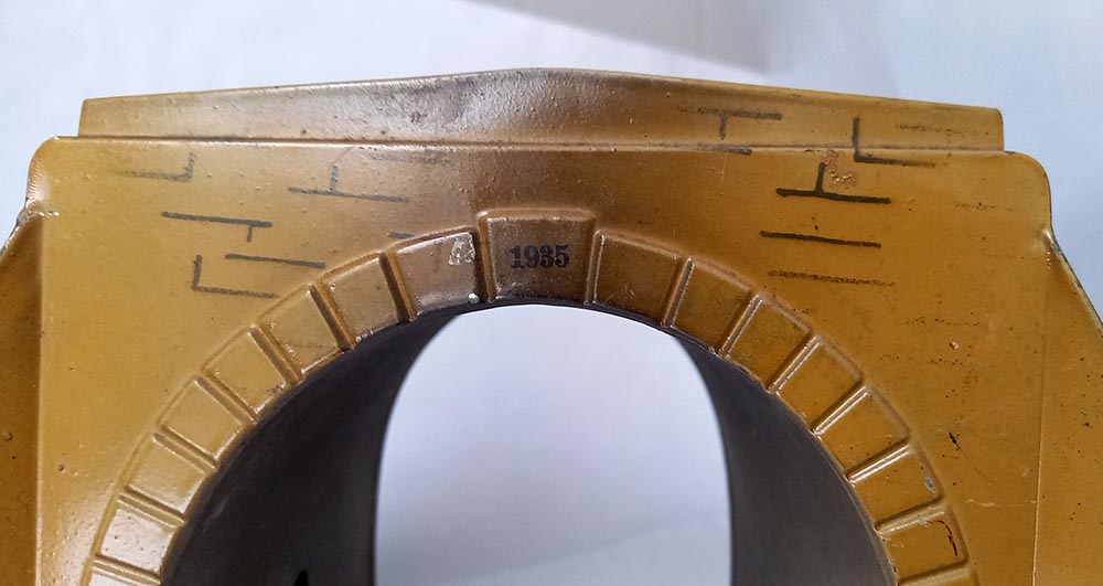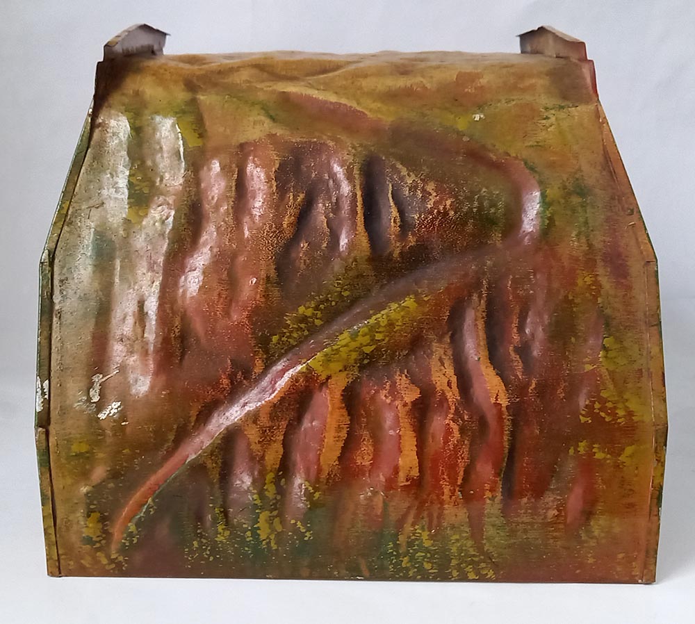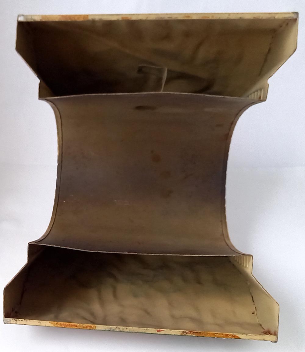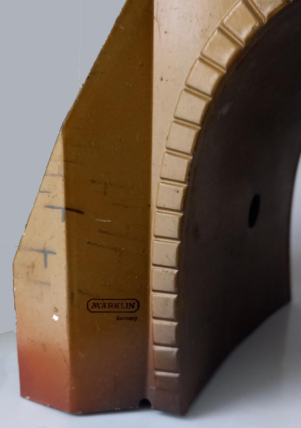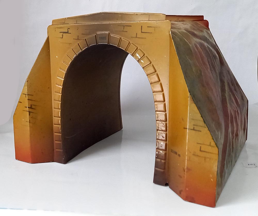 30-er jaren. Geheel van blik. Opdruk 2518/0, te gebruiken bij spoor-0 en misschien ook wel bij spoor-1. De tunnel verkeert in uitstekende staat met slechts aan 1 zijde een kleine beschadiging. Doorrijhoogte ca. 15 cm, doorrijdbreedte beneden ca. 12 cm, Lengte 22 cm.