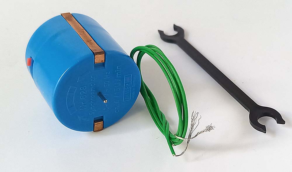 Faller/Pola 180629/330090 Synchroon-Hobbymotor. Schakelbaar van vooruit/achteruit. Werkspanning 14-16 Volt wisselstroom. Kleur: blauw. Met stukje gereedschap, zonder andere onderdelen. Getest, uitstekende staat.