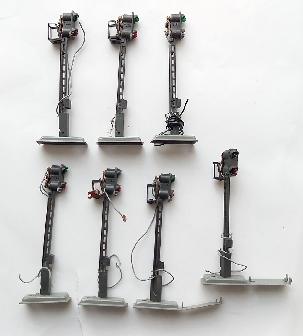 7 palen met lampen van sein 7188 van Märklin. De seinen zijn gemonteerd op onderplaatjes van Vollmer bovenleiding. Niet getest.