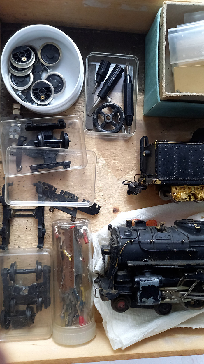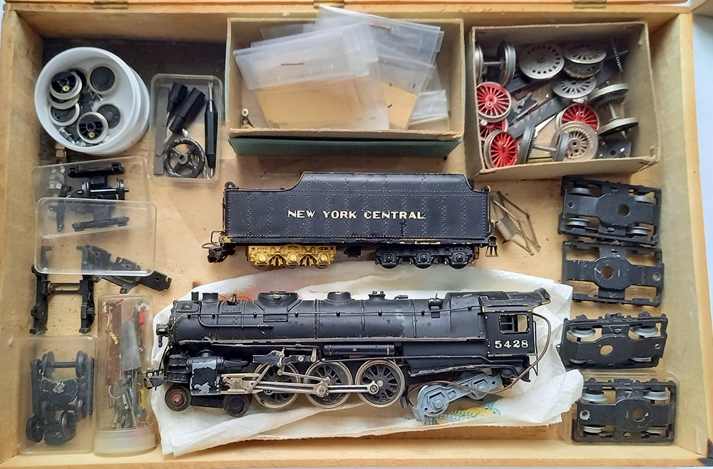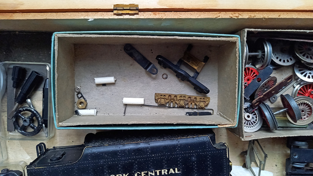 die helemaal vanuit Japan hiernaartoe gereisd is. Inclusief alle onderdelen in de kist. In de plastic zakjes (gele ondergrond) zitten miniscuul kleine onderdelen. De loc is compleet metaal (brass?), het licht brandt, maar verder niets.