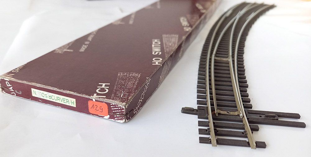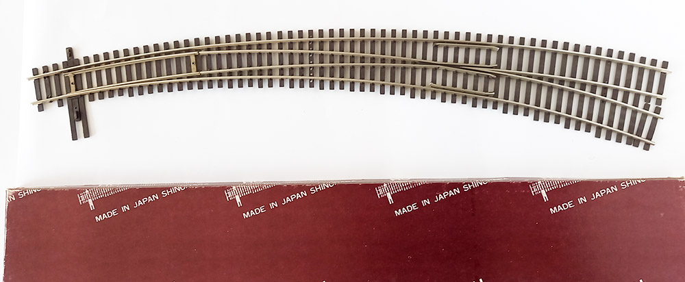 Shinohara, code 100, nikkel zilver, meegebogen wissel rechts, handbediening, lengte ongeveer 420 mm, uitstekende staat, originele verpakking.