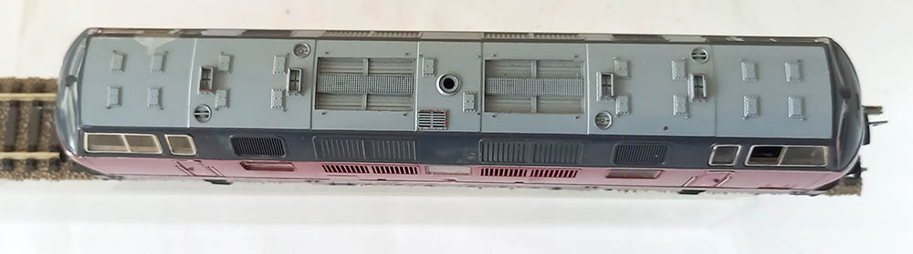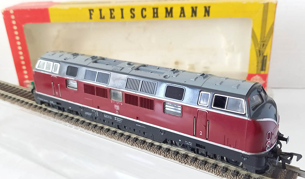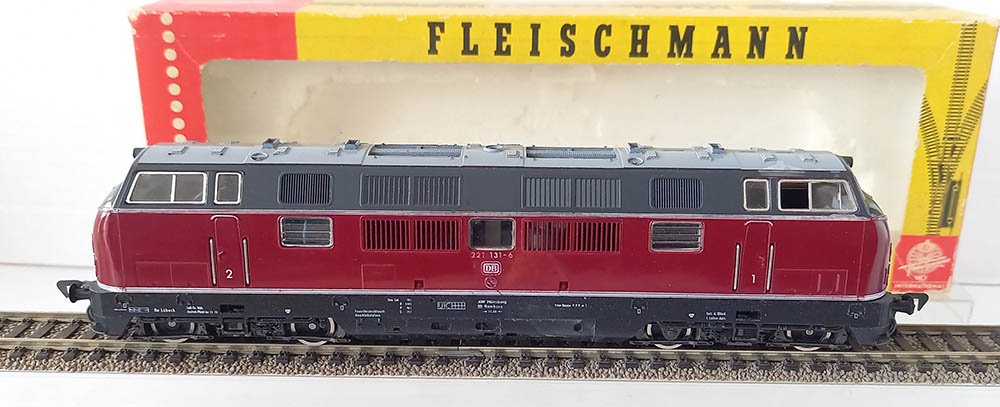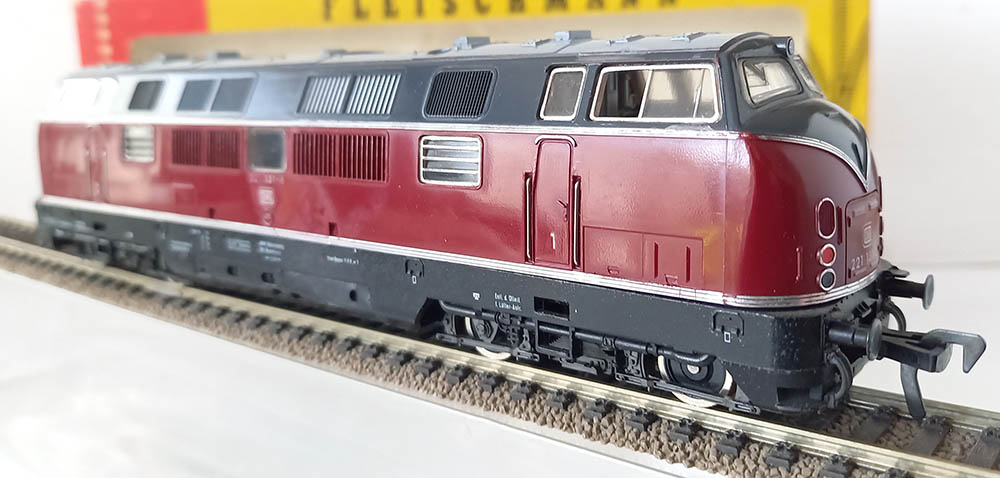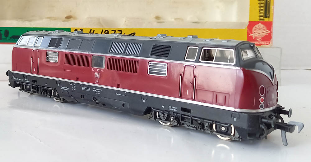 Dieselloc serie V200 van de Duitse Spoorwegen. Kunststof, rood/zwart, grijs dak, drielicht frontver-lichting wisselend met de rijrichting. Goede staat in (gehavende) verpakking.