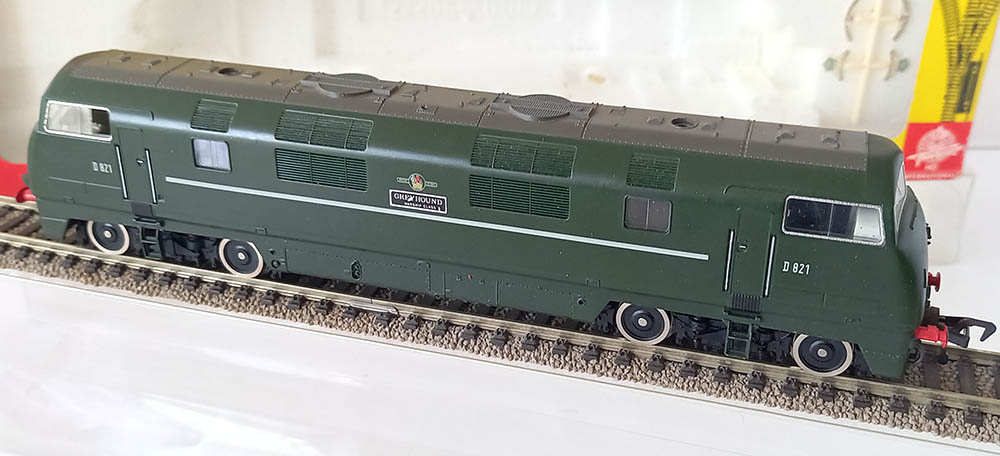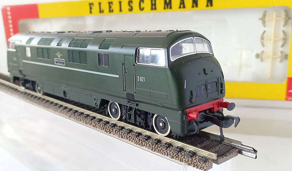 van de ‘Warship’-klasse van British Railways in de groene kleur. Wisselende verlichting bij veranderen van de rijrichting. Soepele en rustige loop. Uitstekende staat in originele verpakking inclusief de schilden om aan de loc te bevestigen. Nouveauté van 1977. Wordt geleverd in de originele verpakking zonder gebruiksaanwijzing.