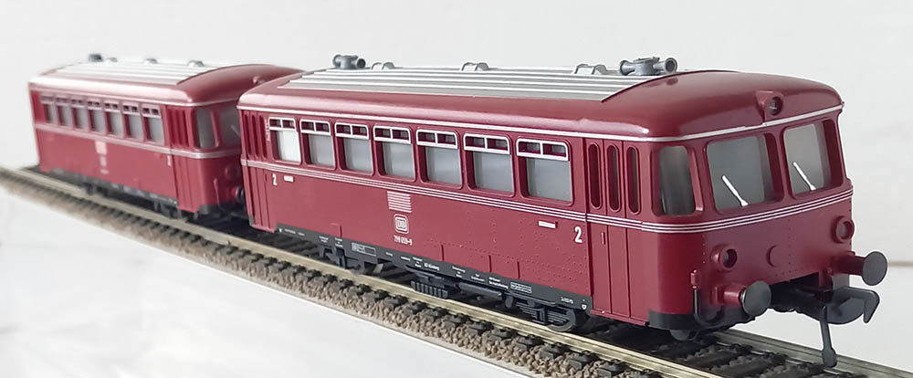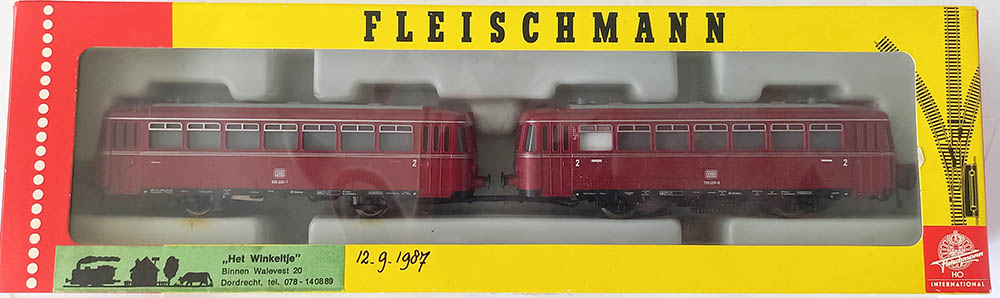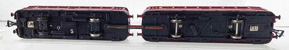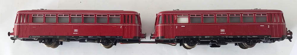 Combinatie van motor-en bijwagen. Kleur rood. Opbouw van kunststof onderstel metaal, lengte 305 mm. Vensters met cellonramen, 3-licht frontverlichting wisselend naar rood bij verandering van rijrichting. Beide eenheden zijn voorzien van binnenverlichting. Uitstekende goedrijdende eenheid in originele verpakking (waarop is geschreven).