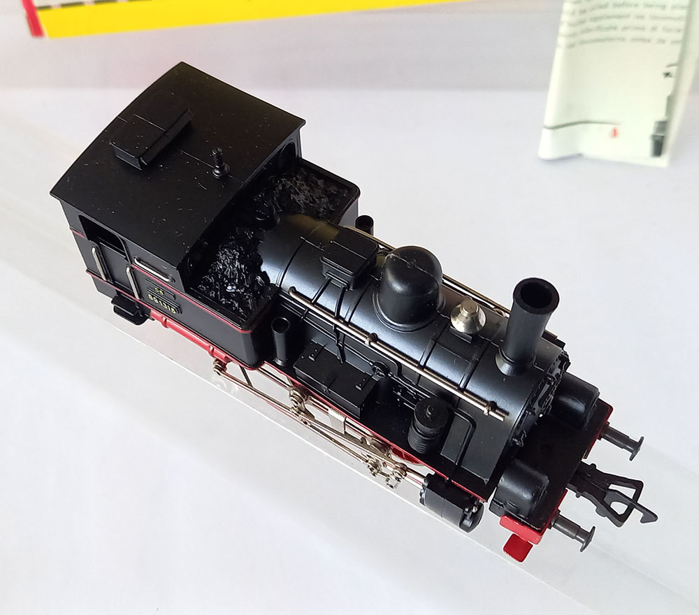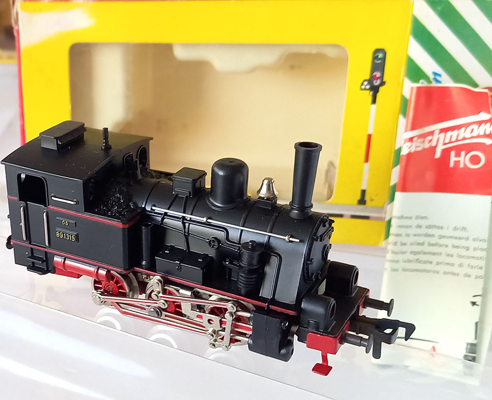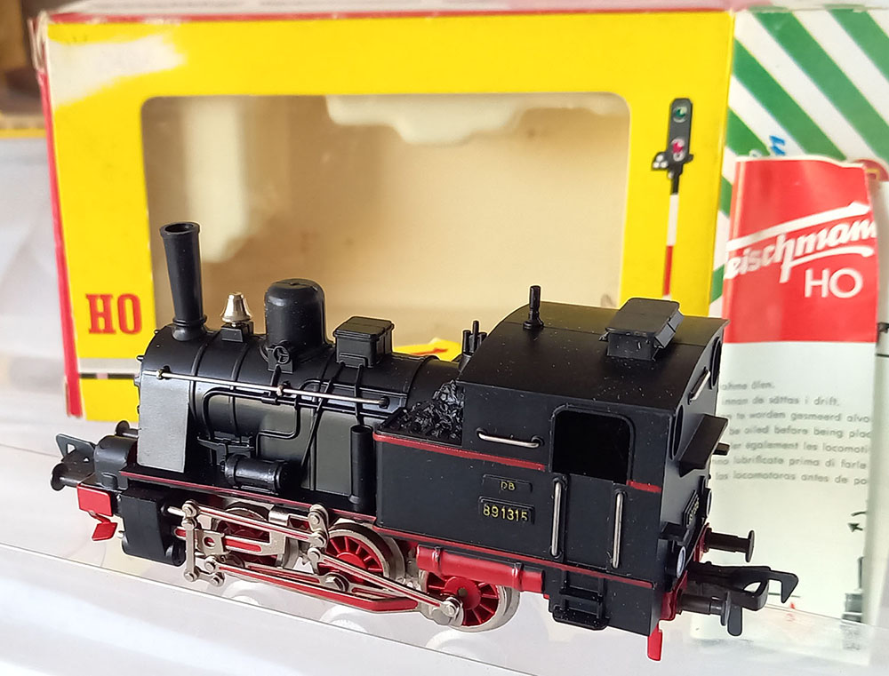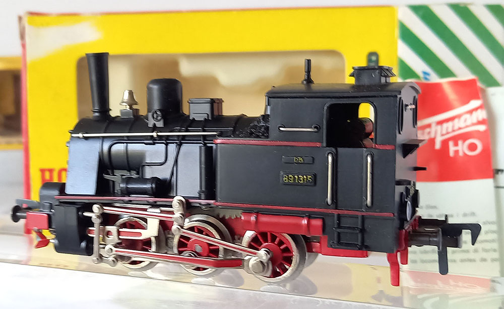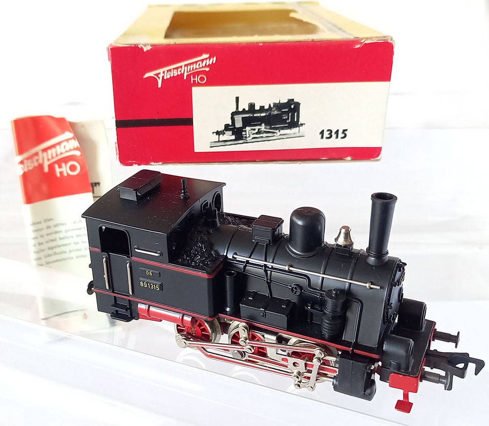 - 1315 Tenderlocomotief , BR89 van de Duitse Spoorwegen, type T3 van de voormalige koninklijke Bayerische staatsbaan, 3-assig, Lengte 115 mm. Metalen onderstel en kunststof bovenbouw. 2 werkende koplampen, uitgebreid drijfwerk. Model is gesmeerd en verkeert in uitstekende staat (nauwelijks gereden) desondanks rijdt deze bij lage snelheid niet helemaal soepel. In originele verpakking met gebruiksaanwijzing. Produktieperiode 1956-1969.