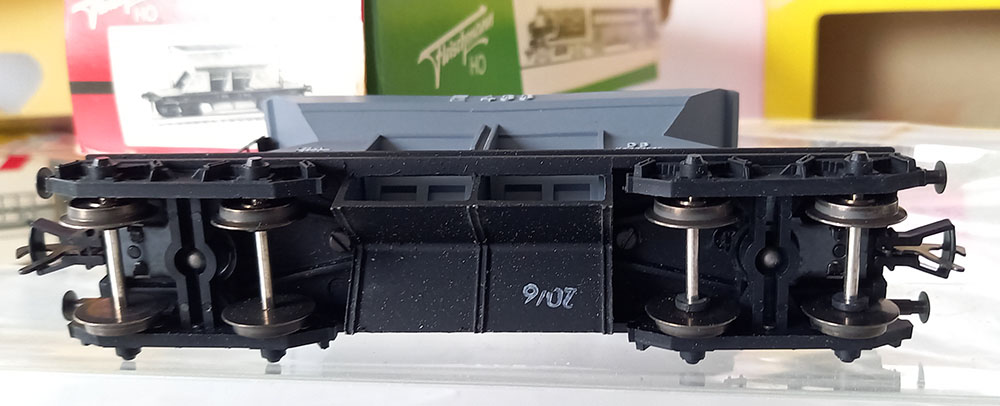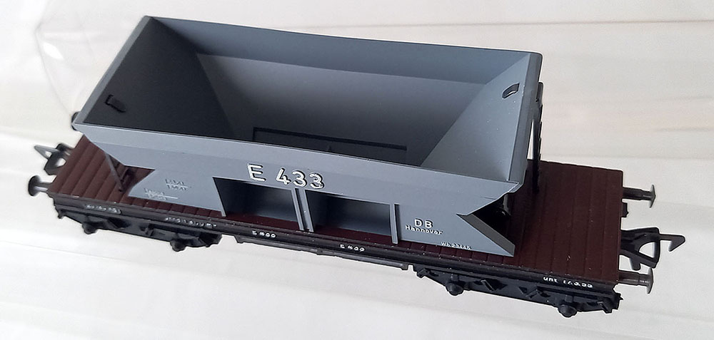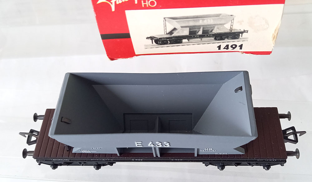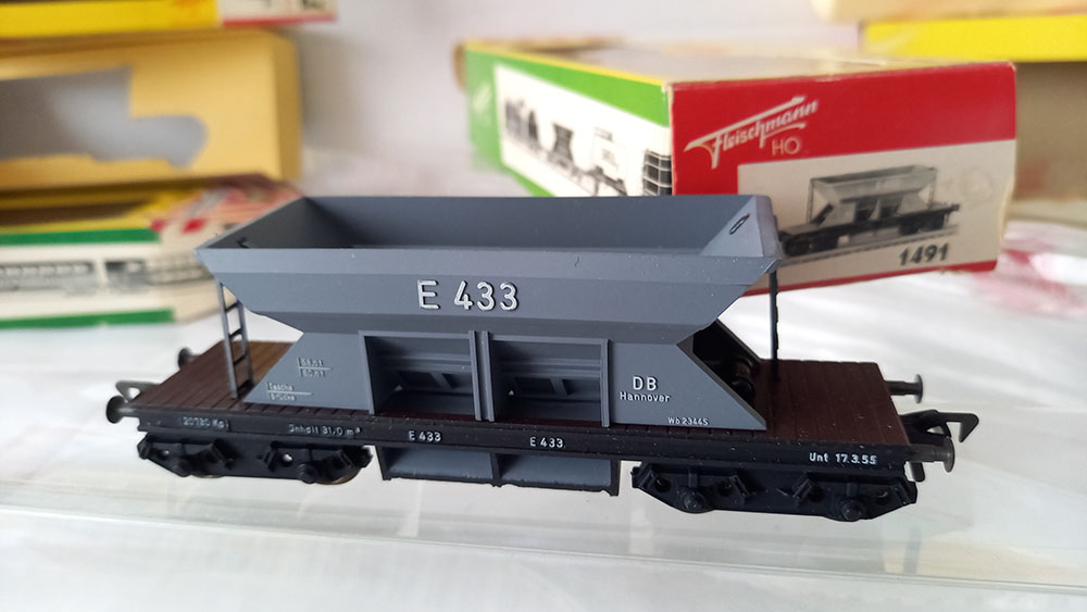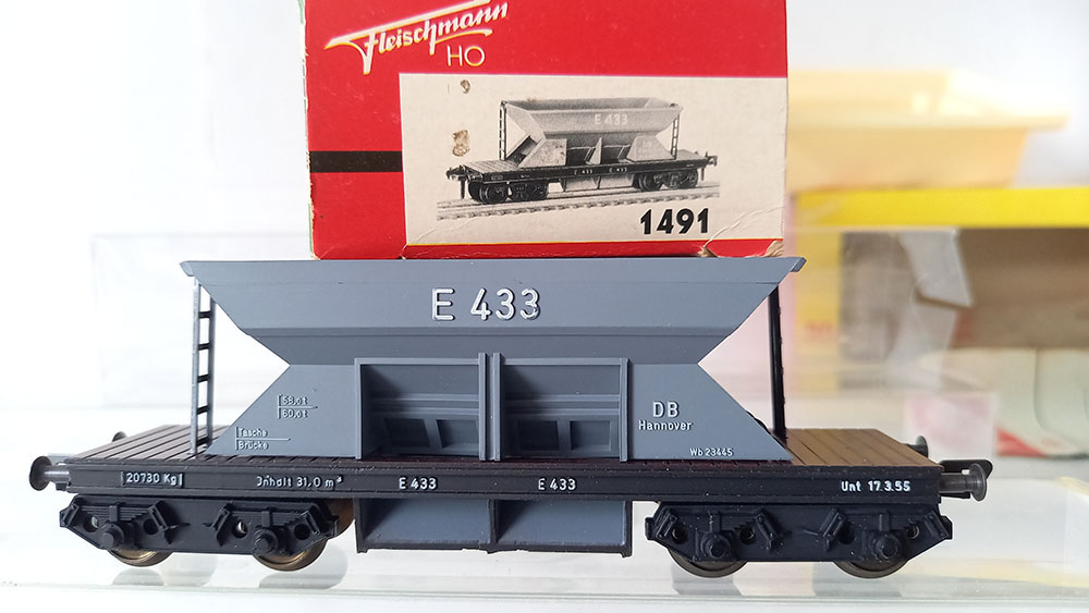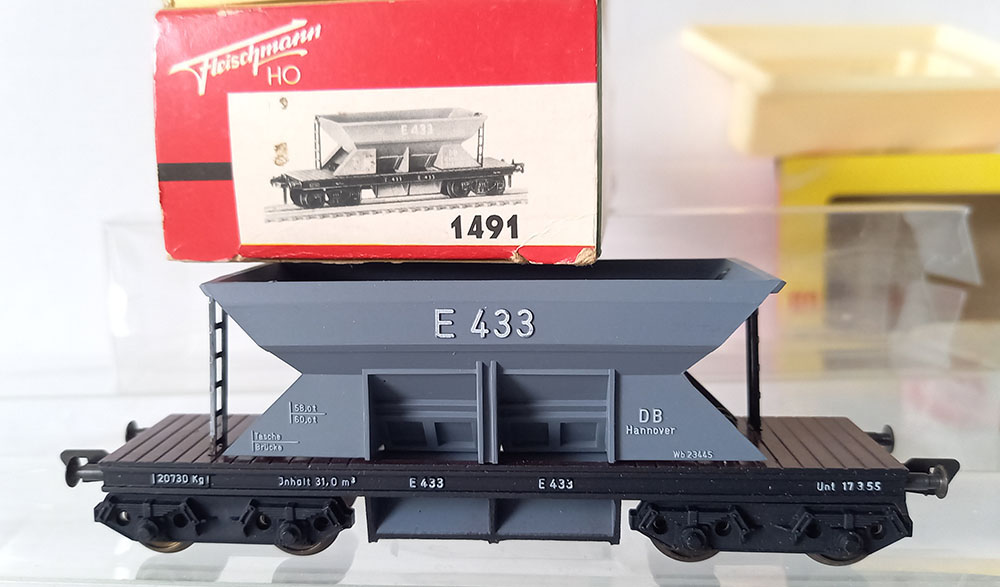 - 2 x 1491 grindwagen, grijs, versie met Duitse draaistellen. Onderstel metaal. Als nieuw in originele verpakking. Geproduceerd van 1961-61/69.