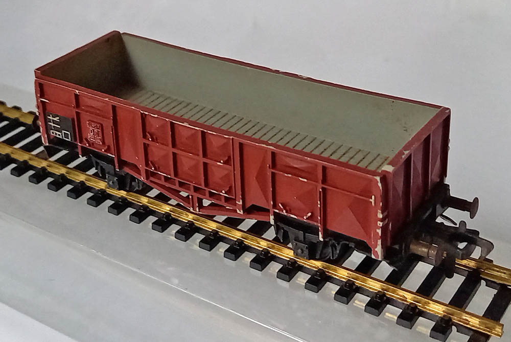 van de Duitse Spoorwegen, type Omm 39". Metalen onderstel. Grijze vloer. Lengte 120 mm. 60-er jaren. Bespeeld.
