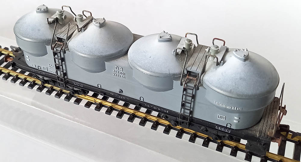 4-assig, model van de silowagen KKds 55 van de DB voor perslucht lossing. Wagenopbouw licht-grijs.Origineel met beschrif-ting en originele wheatering bij de domen.Lengte 170 mm. De wagen verkeert in goede staat.