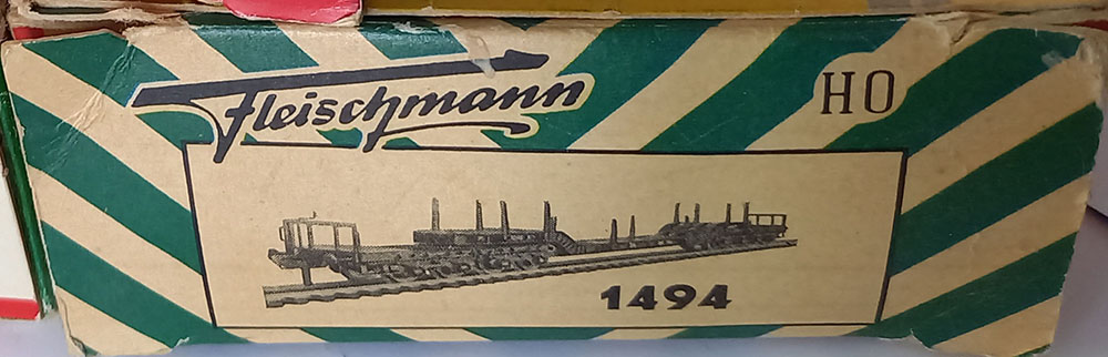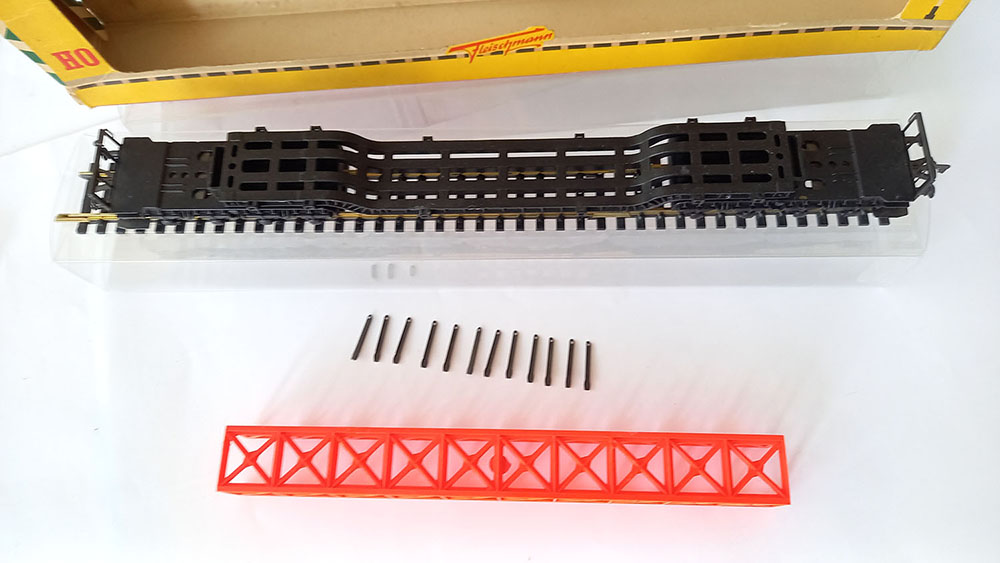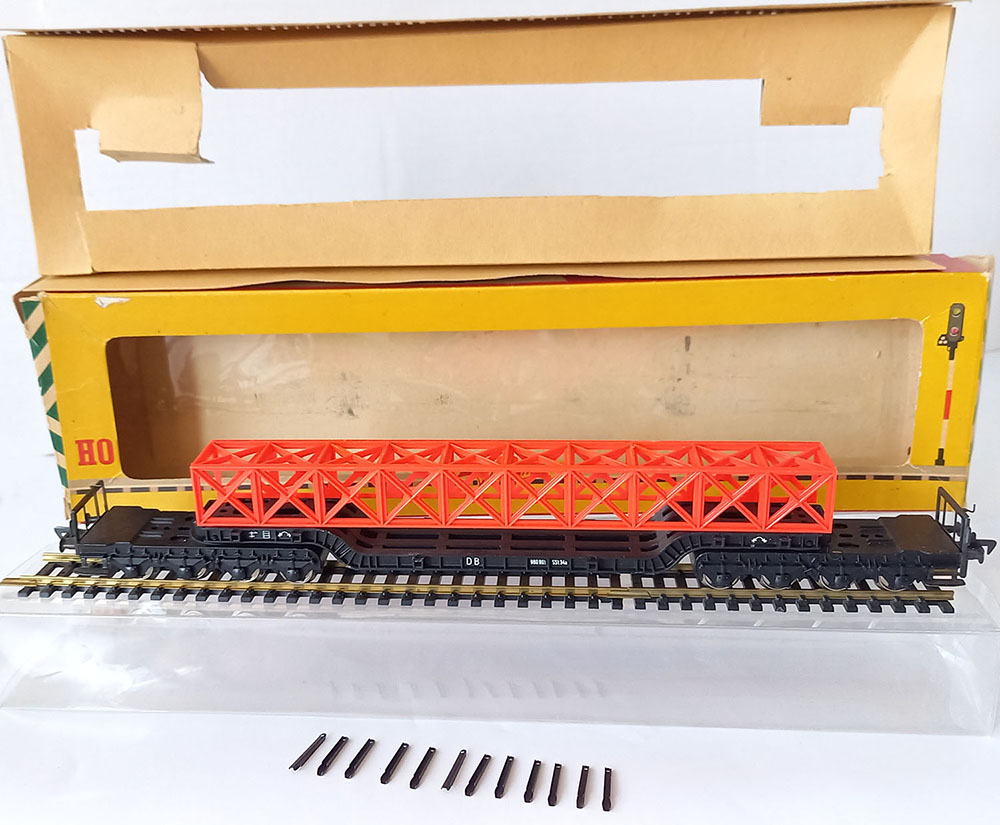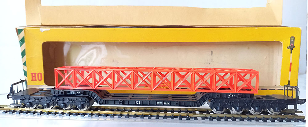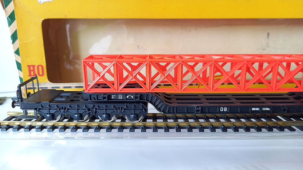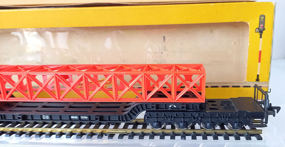 type SSt 34 van de Duitse Spoorwegen, 6-assig, metaal, met 12 insteekbare rongen, beladen met een brugdeel. Lengte 290 mm. Uitstekende staat in originele complete verpakking. Vintage, midden 60-er jaren.