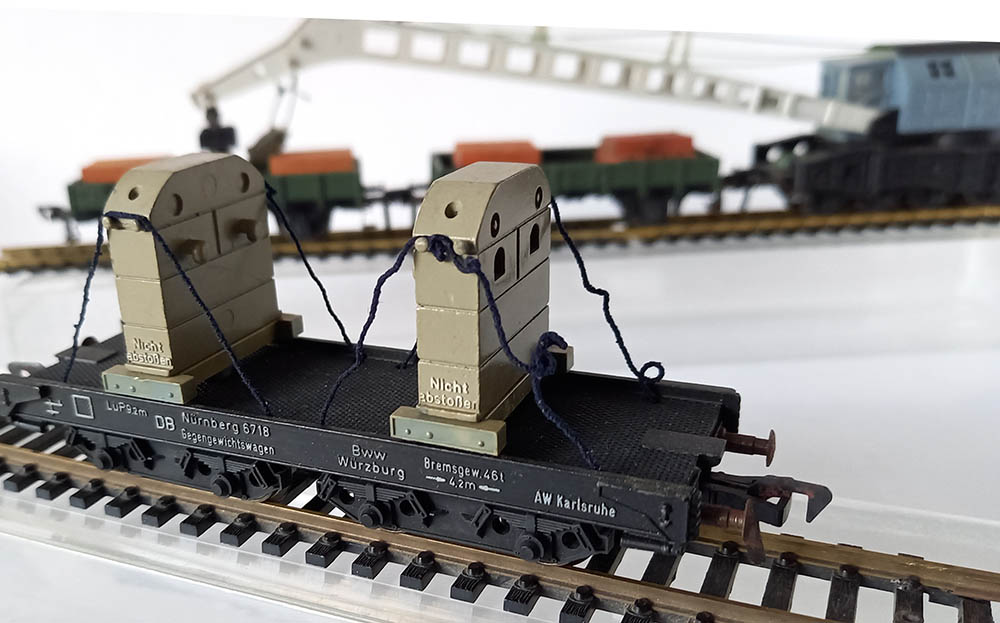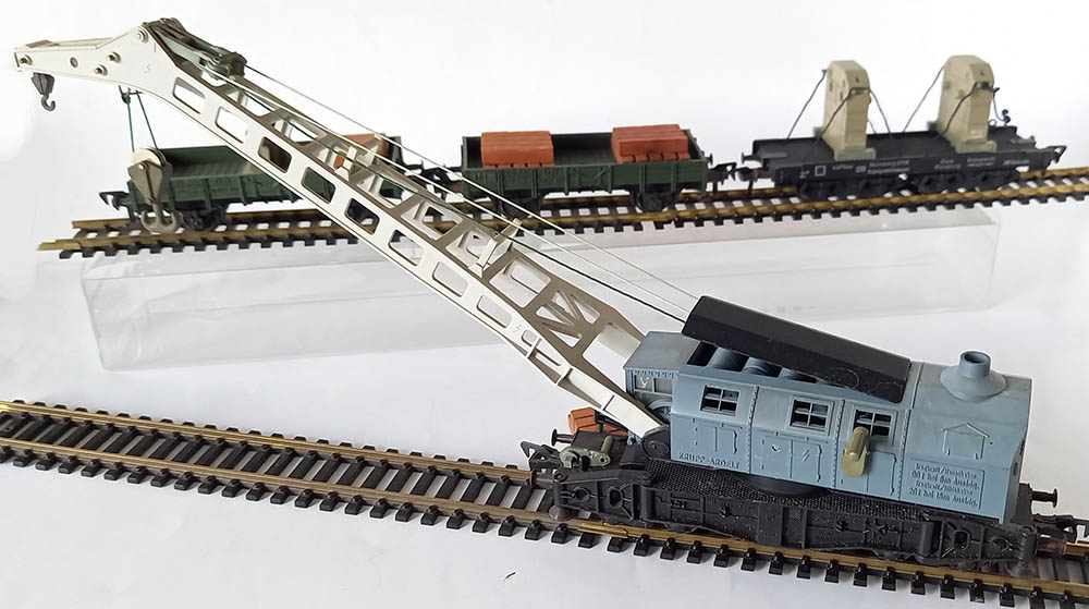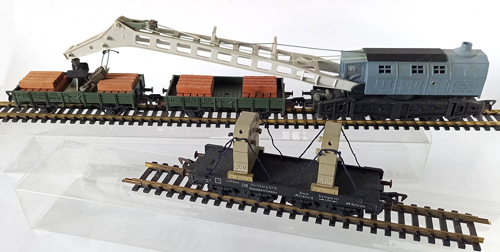 De kraanarm rust op ondersteuningswagen 1451A en afstandswagen 1451H zorgt ervoor dat de ondersteuningswagen op goede afstand blijft. Zowel de 1451A en 1451H bevatten elk twee houten onderstoppers waarmee de kraan tijdens de werkzaamheden stabiel blijft. Tesamen bevat de set inclusief de kraan 4 wagens. Apart toegevoegd zouden de gereedschapswagen 1464 G en werknemerswagon 1417 M kunnen worden. Lengte 485 mm. Goede staat.