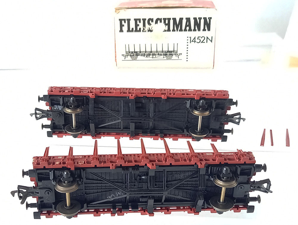 2-assig, wagons zelf verkeren in uitstekende staat, maar rongen ontbreken geheel of gedeeltelijk. 1 x originele verpakking. Prijs is voor beide wagens.