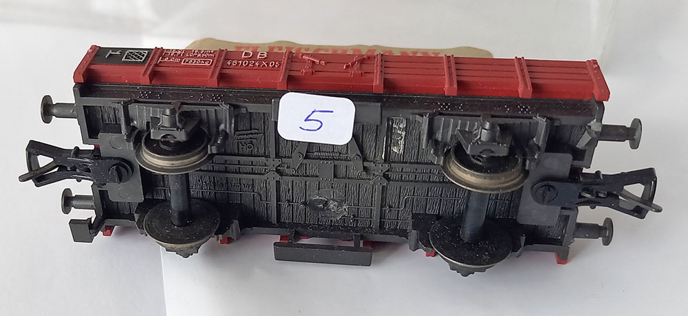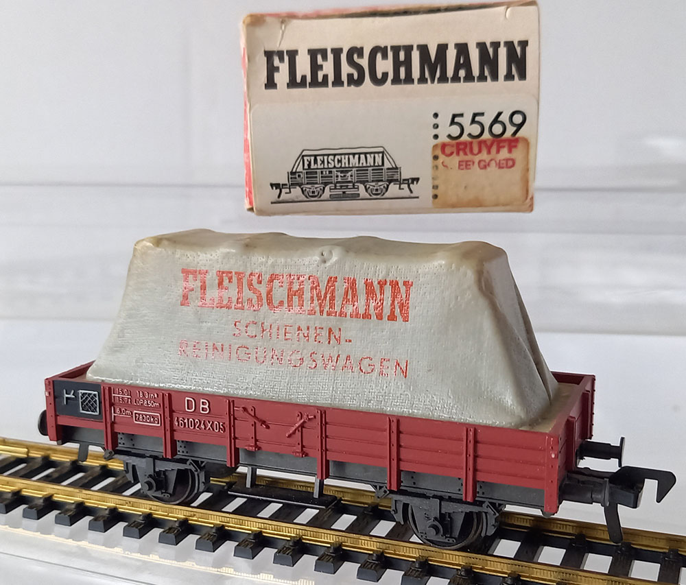 met opschrift 'Fleischmann" (N.B.: dit is geen railreinigingswagen). Huif wat smoezelig, 1 step missend, verder goede staat. In verpakking met verkeerd nummer.