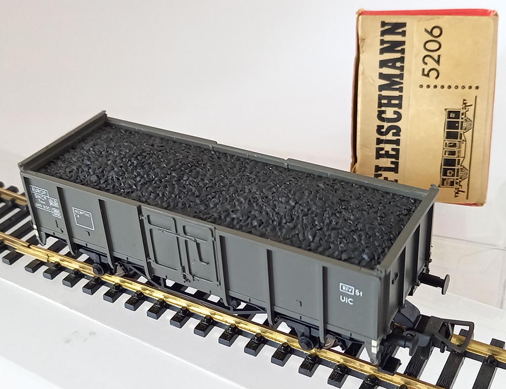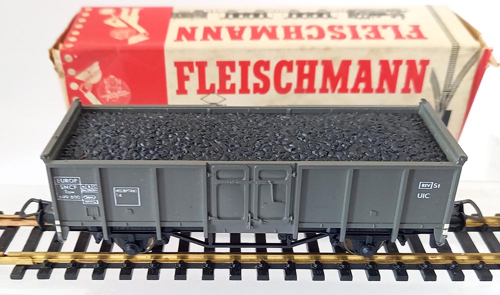 Europ goederenwagen van de SNCF, serie “Tow”. Grijze uitvoering met originele opschriften. Kolenvulling uitneembaar. Beugelkop-pelingen (verwisselbaar). Lengte 112 mm. Nieuwwaardige staat in de originele verpakking. Verpakking is smoezelig.