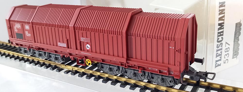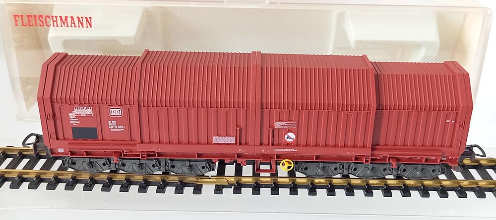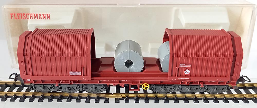 van de DB. Model van een Sahimms telescoopwagen beladen met 2 uitneembare staalrollen. De huif is verschuifbaar. Beugelkoppelingen (verwisselbaar). Lengte 172 mm. Als nieuw in originele verpakking.