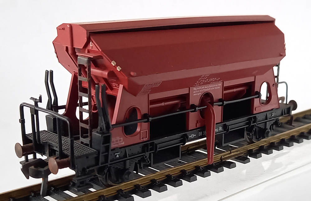 van de Duitse Spoorwegen met zwenkdak en 4 beweegbare afsluiters in de wagenvloer voor het automatisch lossen van stortgoed. Haakkoppeling. Goede staat.