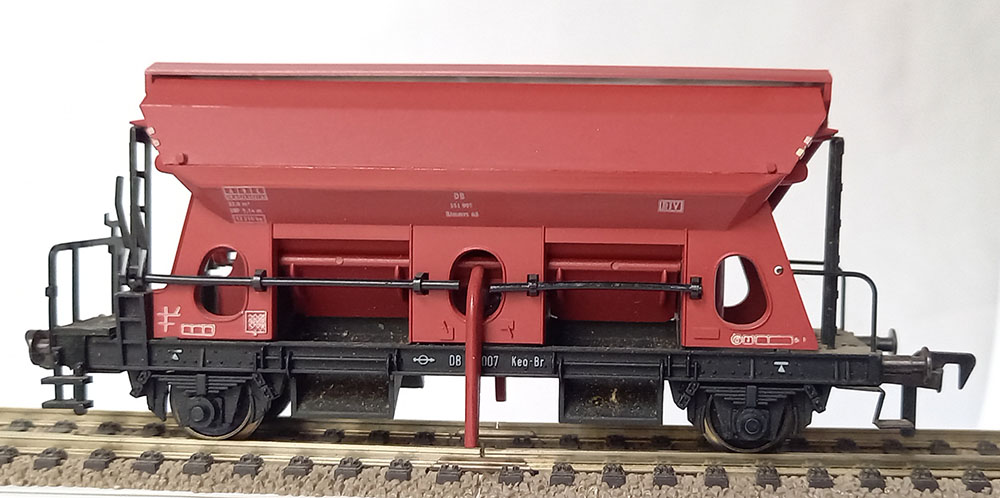 Roodbruine zelflosser van de Duitse Spoorwegen met zwenkdak en 4 beweegbare afsluiters in de wagenvloer voor het automatisch lossen van stortgoed. Haakkoppeling. Uitstekende staat.