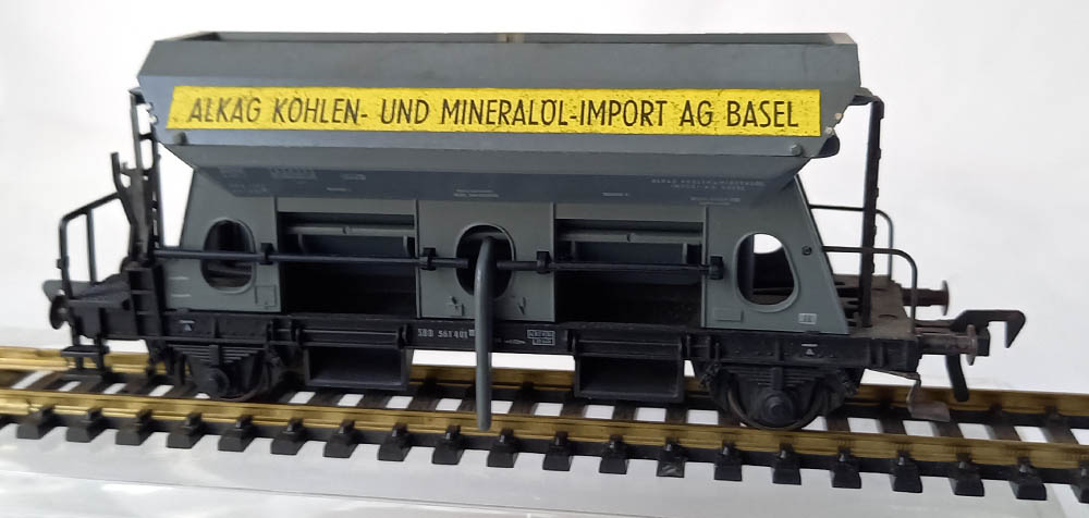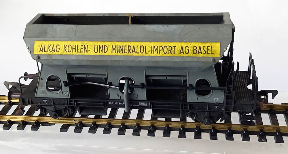 Zelflosser van de firma "ALKAG" in Basel. Voorzien van 4 beweegbare afsluiters in de wagenvloer voor het automatisch lossen van stortgoed. Grijze SBB uitvoering met originele opschriften. Haakkoppeling. Compleet maar smoezelig.