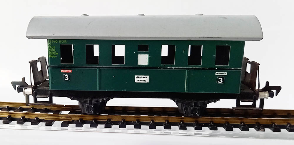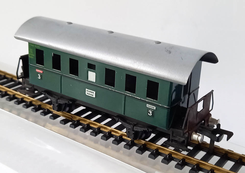 , groen, 3e klasse, zilveren buffers, geheel blik. lengte 12 cm. Ca. 1955. Goede staat.