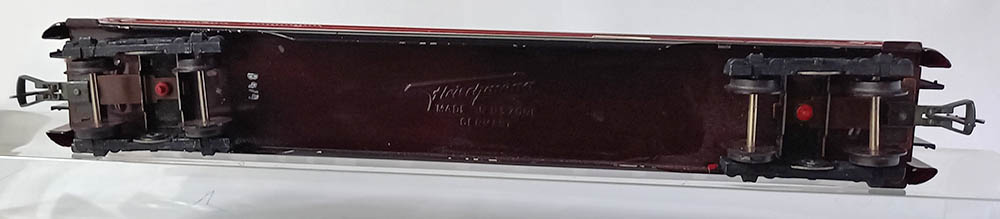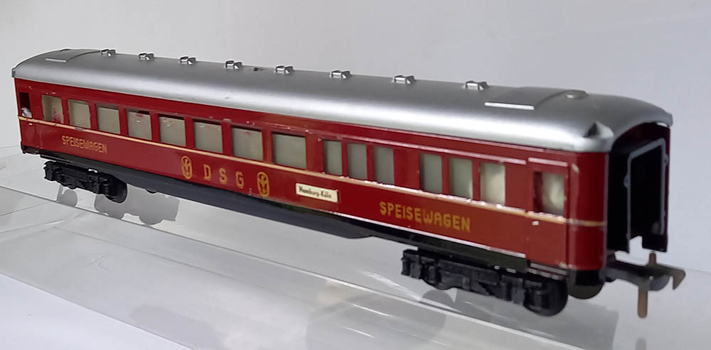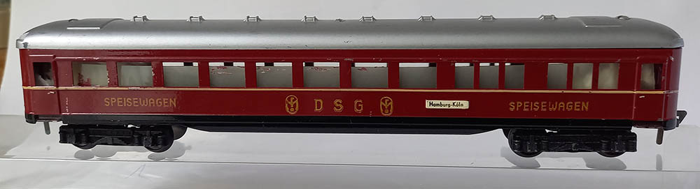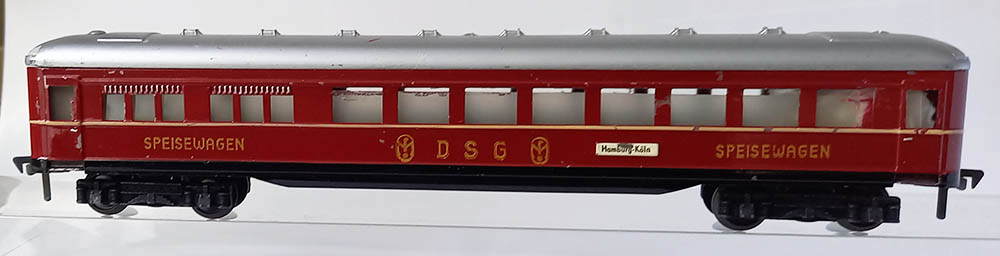 Speisewagen DSG, rot, K1, draaistellen, bodem en kunststof wielen bruin, koersbord „Hamburg-München“ verheven, Keuken rechts. Redelijke, cellon ramen liggen los. Produktie rond 1955.