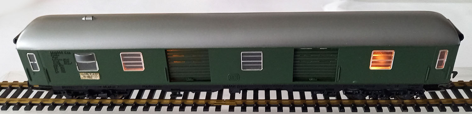 model type Düm van de Duitse Spoorwegen, ingezette ramen, beweegbare rolluiken. verlichting aanwezig. 245 mm. Uitstekende bijna nieuwwaardige staat. Gebouwd uit bouwpakket, dus geen witte opschriften.