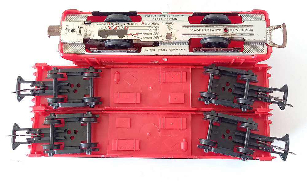 1 opwindloc type BB 9004 SNCF, rood. Redelijke optische staat, maar het opwindmechanisme werkt niet, daarbij 2 rode passagierwagons van de Franse Spoorwegen, 8 gebogen rails.