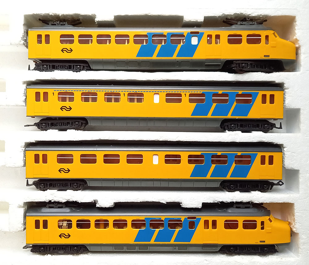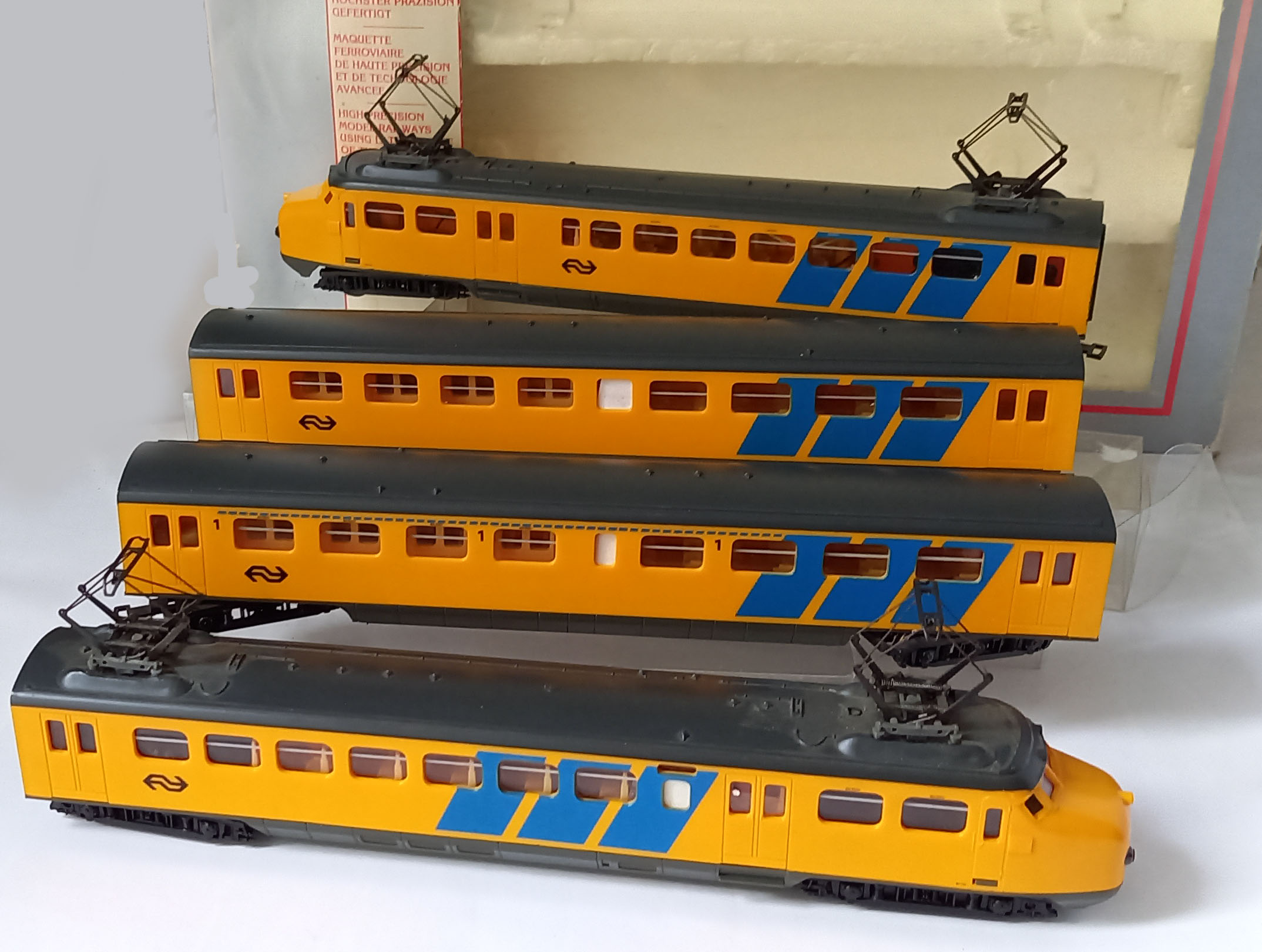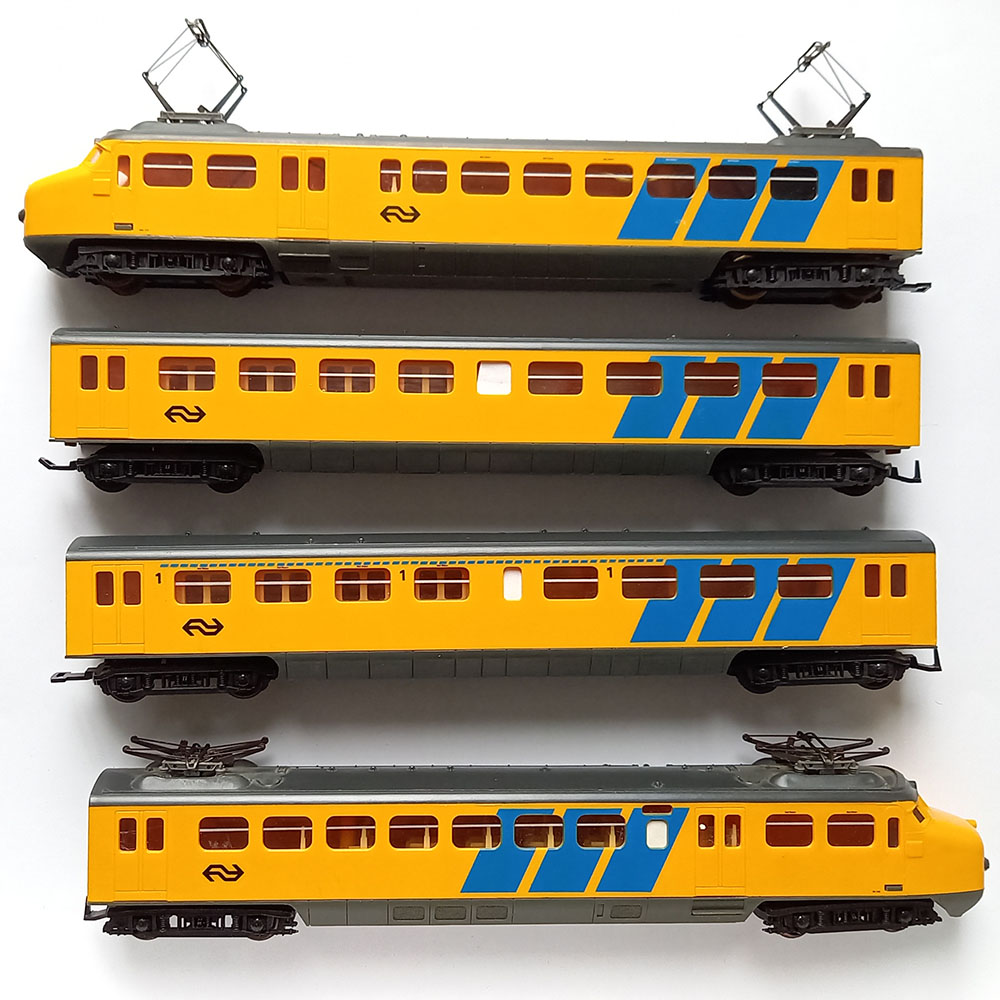 Electr.treinstel NS Hondekop/Mat 54, nr 728, geel, 4-delig, reclamebanen en werkende verlichting aan 1 zijde. Getest en rijdt goed. Uitstekende staat in originele (wat gehavende) verpakking.