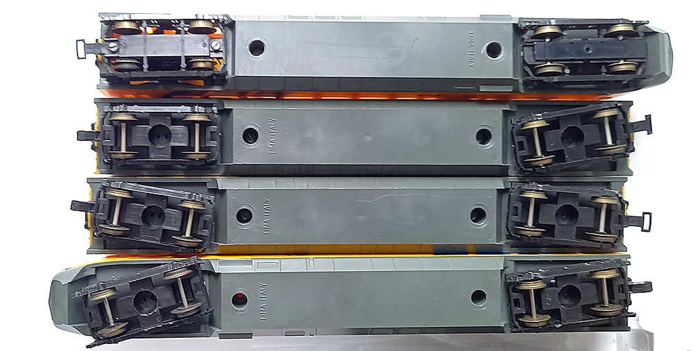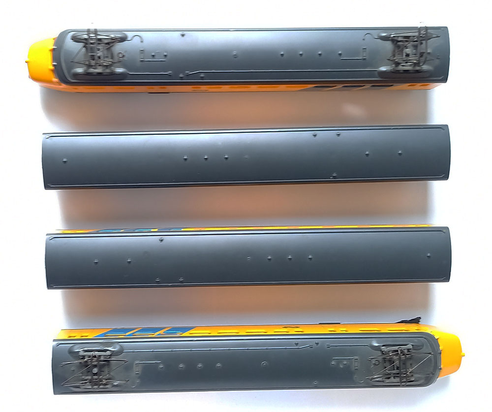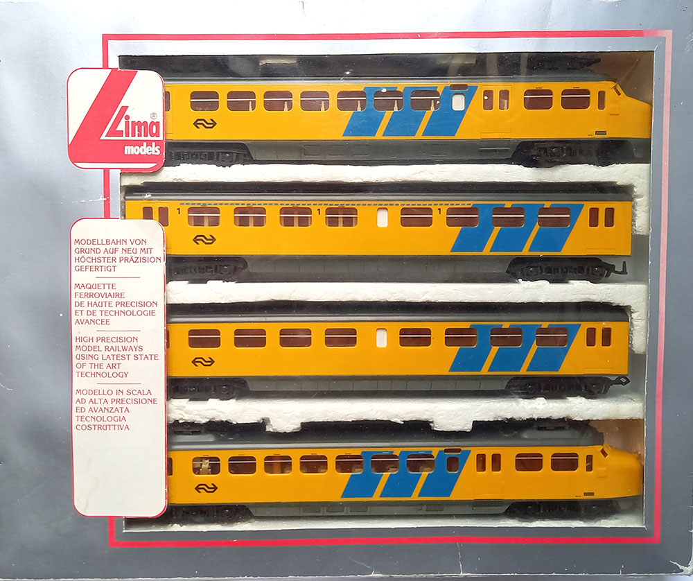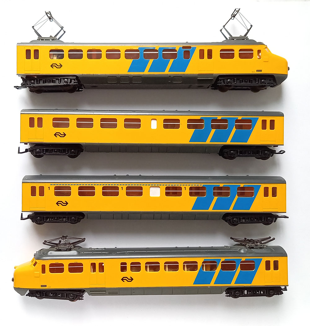 Electr.treinstel NS Hondekop/Mat 54, nr 728, geel, 4-delig, reclamebanen en werkende verlichting aan 1 zijde. Getest en rijdt goed. Uitstekende staat in originele (wat gehavende) verpakking.