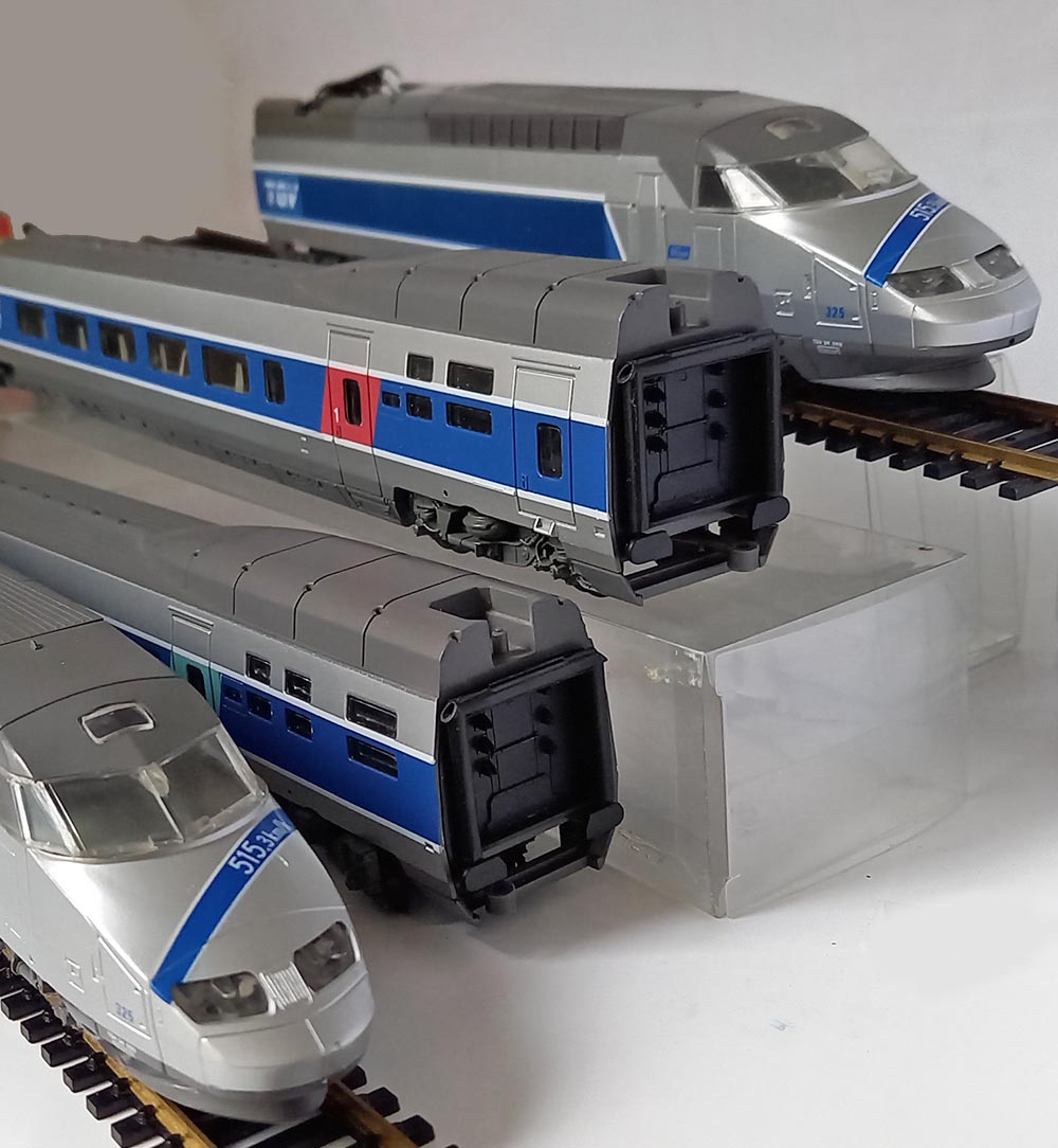4-delig treinstel van de Franse Spoorwegen (SNCF), kleur blauw/zilver. Het model draagt treinnummer 325 dat het wereldrecord voor de snelste trein behaalde met een snelheid van 515,3 km/h. Tijdperk V. Verlichting in het motordeel. Met interieur. Het treinstel verkeert in uitstekende staat, maar op 1 plaats zit er een weinig kleurverschil, zie laatste foto. Het treinstel wordt geleverd in de originele verpakking, met losse isolatoren en met gebruiksaanwijzing. Deze versie van het recordtreinstel is moeilijk te vinden.