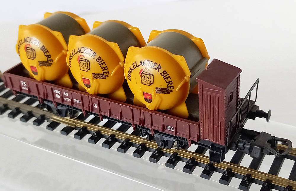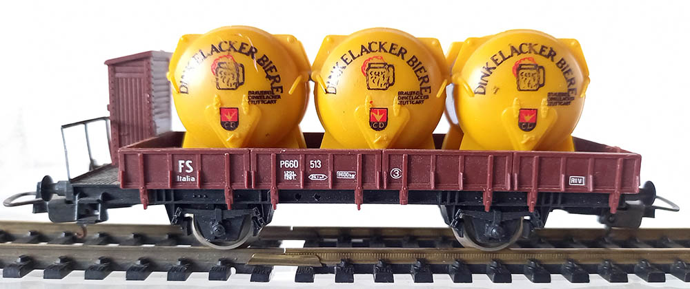 van 3 biercontainers met opschrift "Dunkelacker Bieren" van de Italiaanse spoorwegen. Lengte 116 mm. Goede staat.