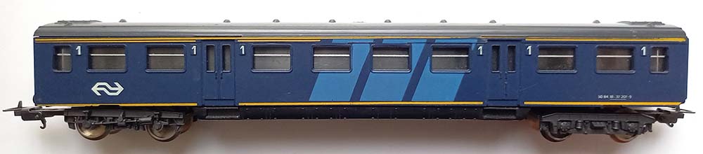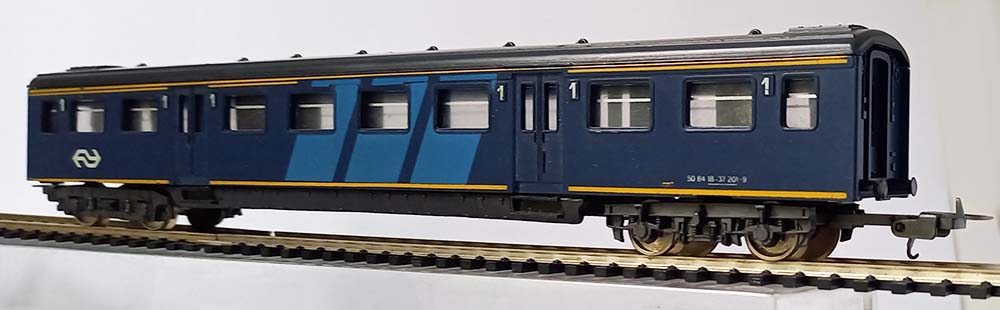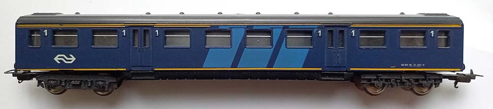 vignet en reklamebanen.Nederlands rijtuig 1e klasse volgens bouwserie A6500. Lengte 253 mm. In de originele kleuren en voorzien van opschriften in relief plastic. Metalen wielen. Uitstekende staat. 1 Koppeling lijkt een fractie langer dan de andere.