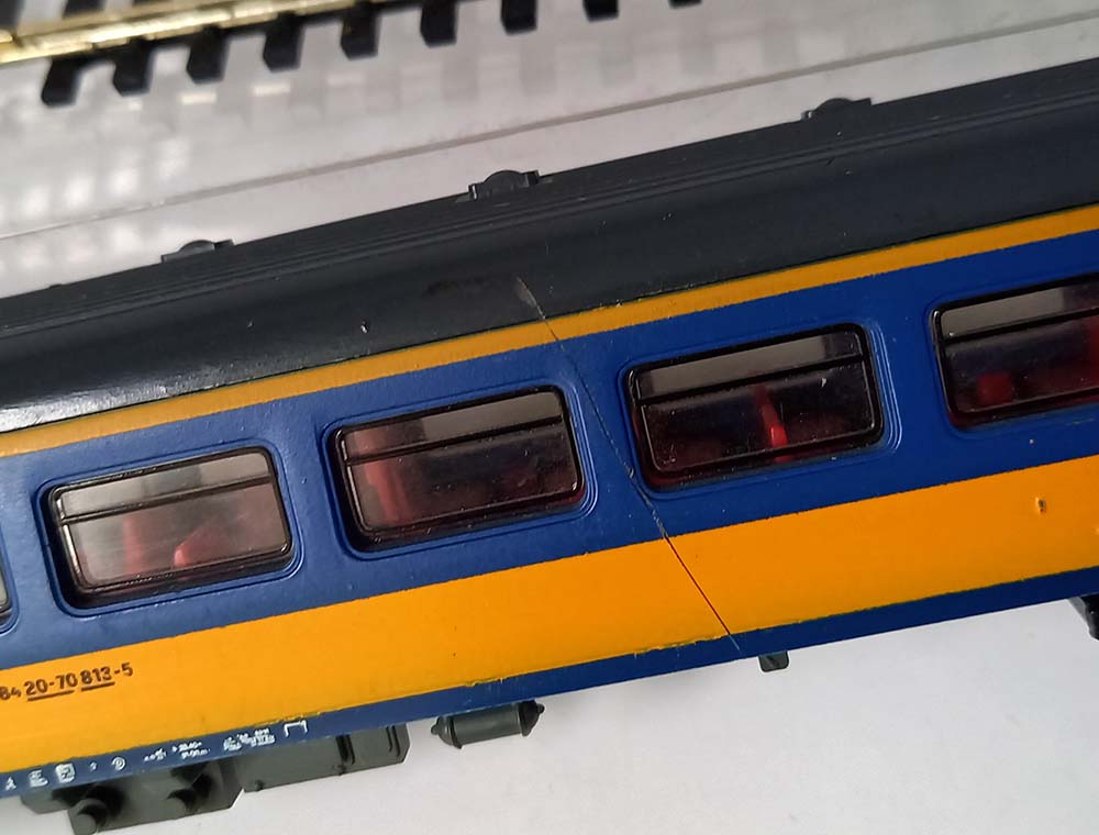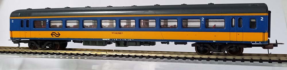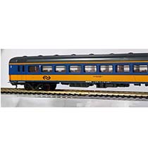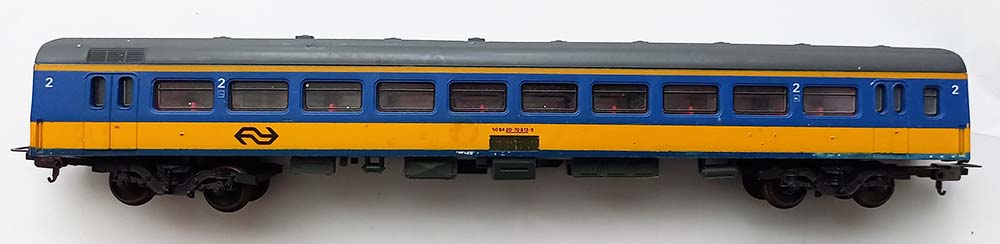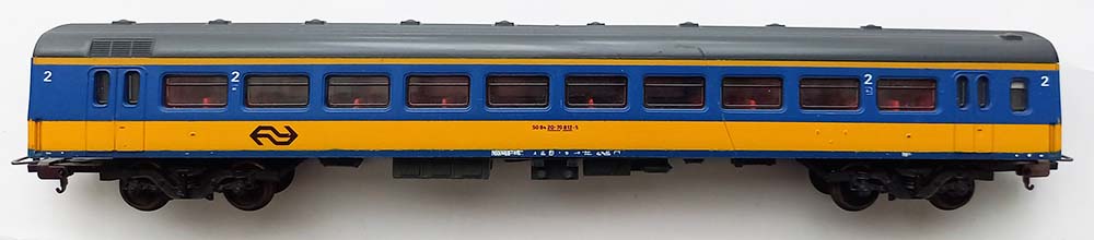 van de Nederlandse Spoorwegen. Geel/blauw. Lengte 262 mm. Optisch goede staat, maar het rijtuig heeft een barst.