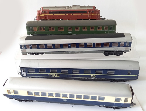 De loc rijdt en schakelt goed. Geen verlichting. Het dak is bespeeld en er ontbreekt de ombouw bij een van de draaistellen. Daarbij 1 Roco bluaw/zilver rijtuig (mist 1 koppeling), 1 x Liliput DR rijtuig (mist 1 koppeling), 1 x Hornby Rheingold rijtuig en 1 x Lima TEN rijtuig.