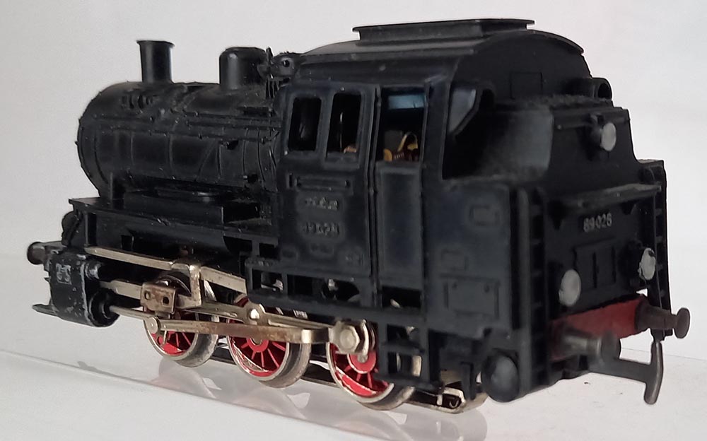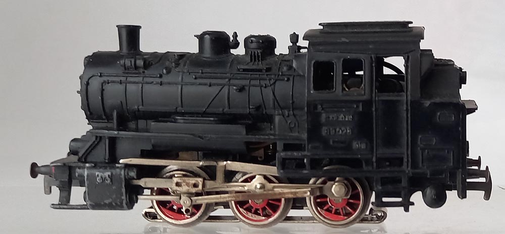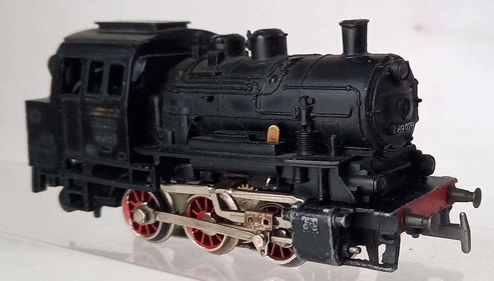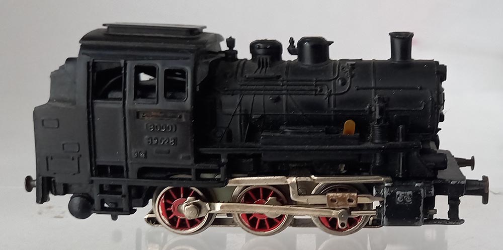 van de Duitse Spoorwegen. 3-Assig, 3 verlichte koplampen, Lengte 11 cm. Veel gereden. Rijdt en schakelt goed.