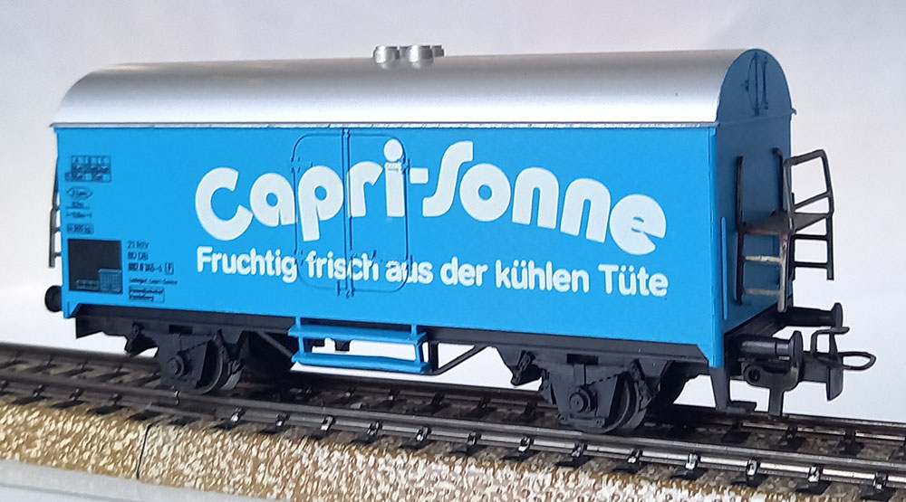 goederenwagen, kunststof, lichtblauw, met opschrift "Capri-Sonne", Wagennr. 082 2 345-5. Uitstekende staat, maar wielasjes roestig.